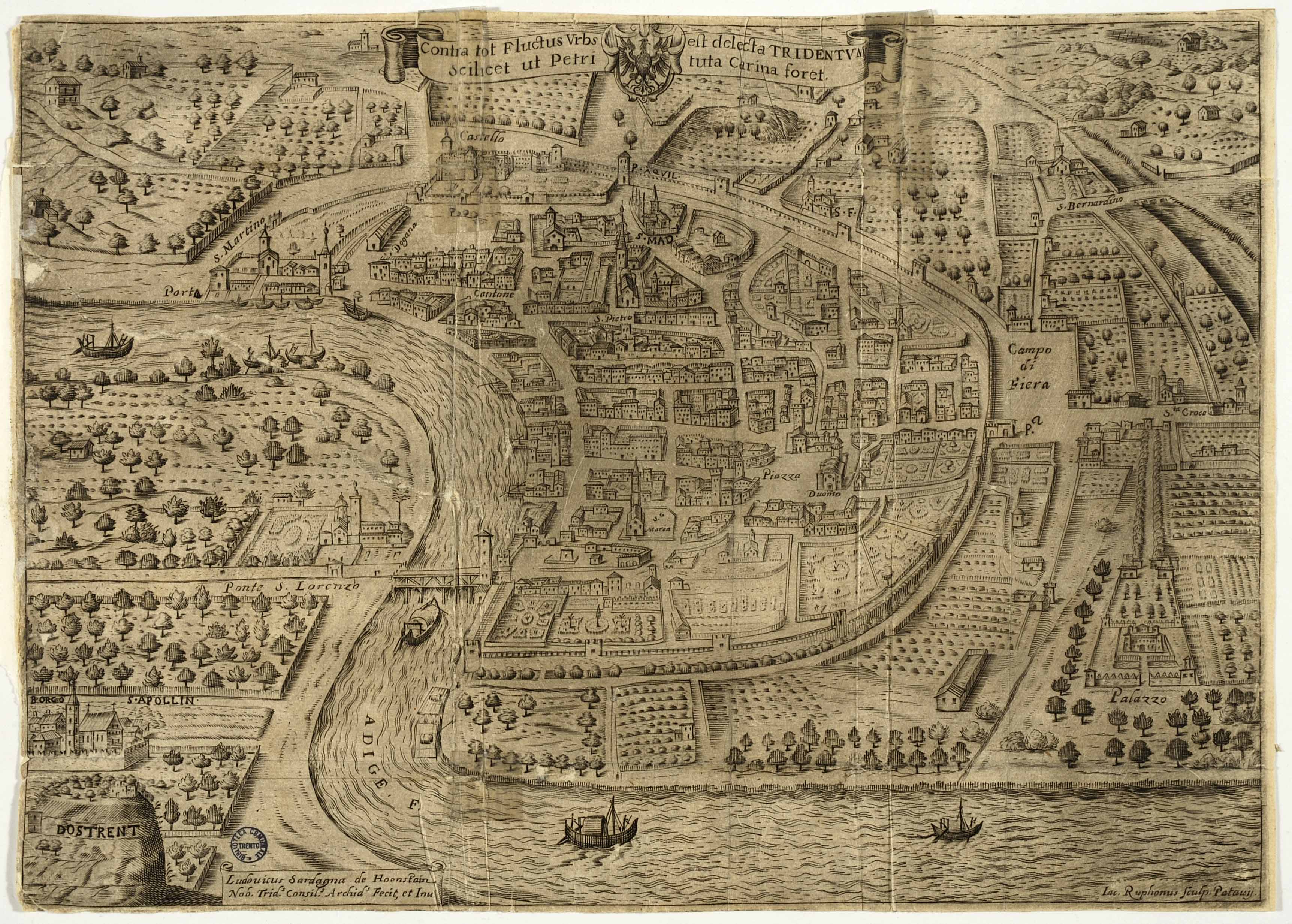 Calcografia; 237x334 mm, 241x345 mm. Disegno di Giacomo Ruffoni, incisione di Ludovico Sardagna, pubblicata in Michelangelo Mariani, Trento con il sacro Concilio et altri notabili, Trento, Carlo Zanetti, 1673
