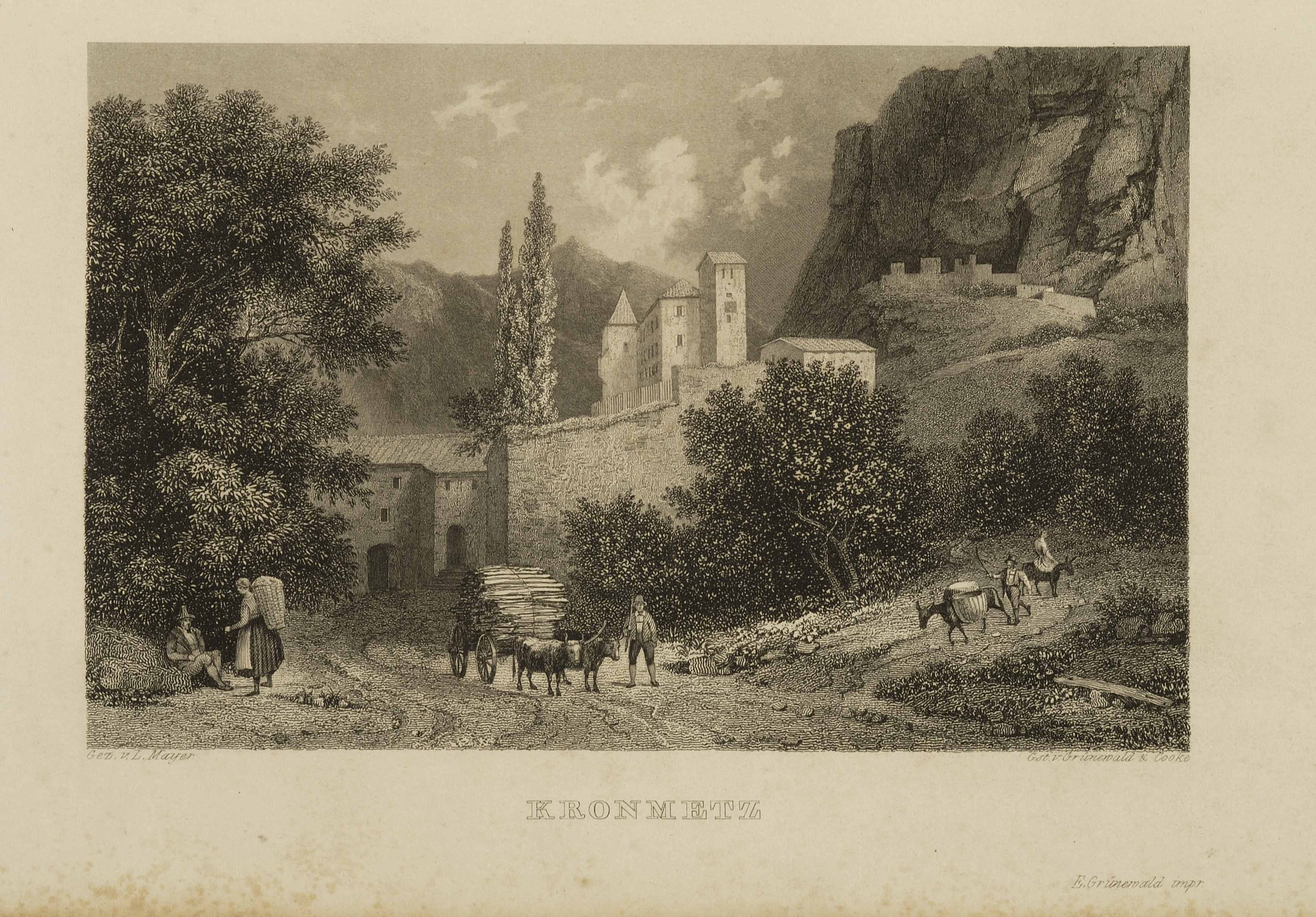 Calcografia; 96x149 mm, su foglio 143x222 mm. Disegno di Louis Mayer, incisione di Ernst Friedrich Grünewald e William John Cooke, pubblicata in Johann Gabriel Seidl, Wanderungen durch Tyrol und Steyermark, Leipzig, Wigand, [1836-1840]