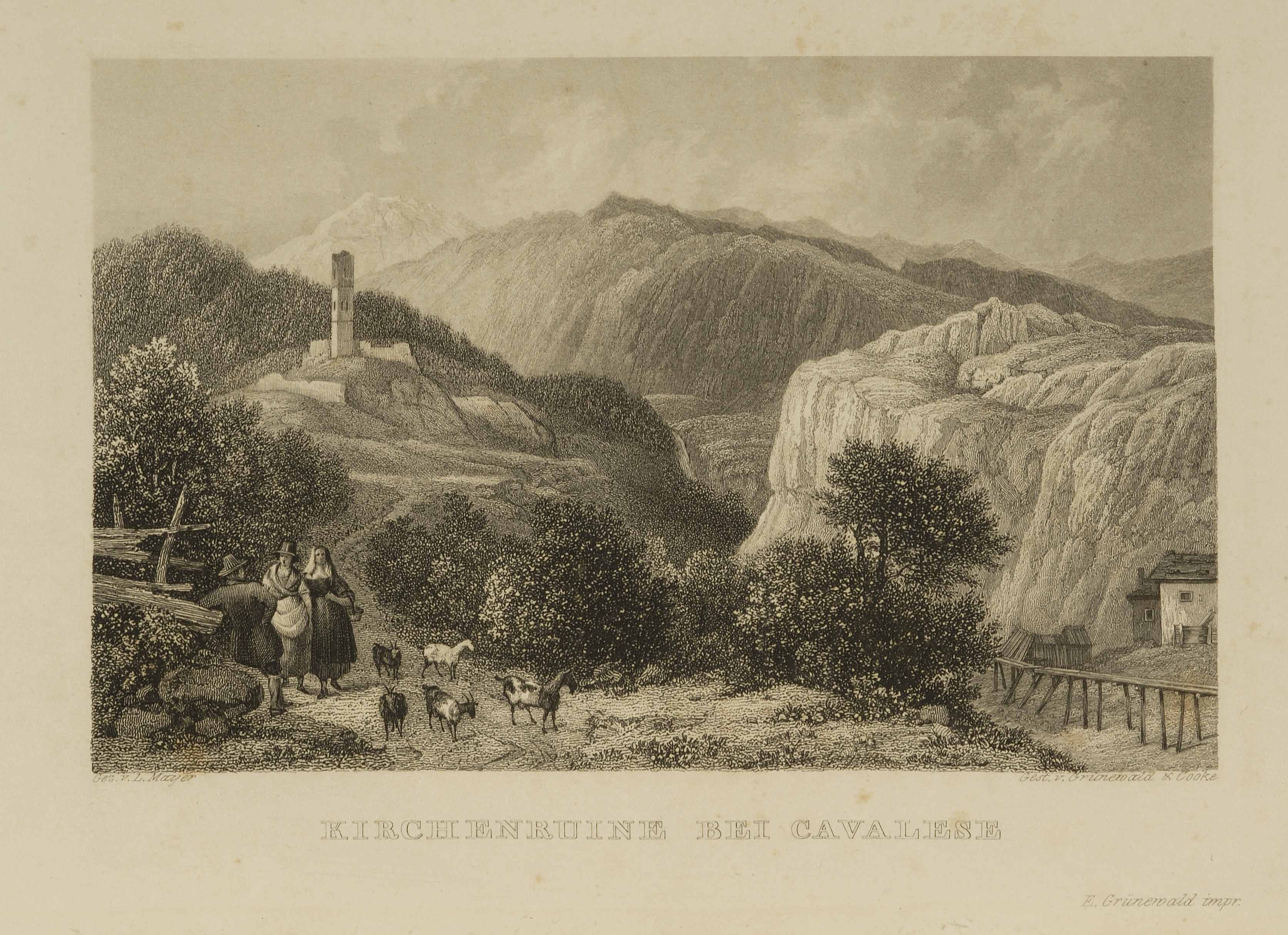 Calcografia; 95x150 mm, su foglio 143x227 mm. Disegno di Louis Mayer, incisione di Ernst Friedrich Grünewald e William John Cooke, pubblicata in Johann Gabriel Seidl, Wanderungen durch Tyrol und Steyermark, Leipzig, Wigand, [1836-1840]