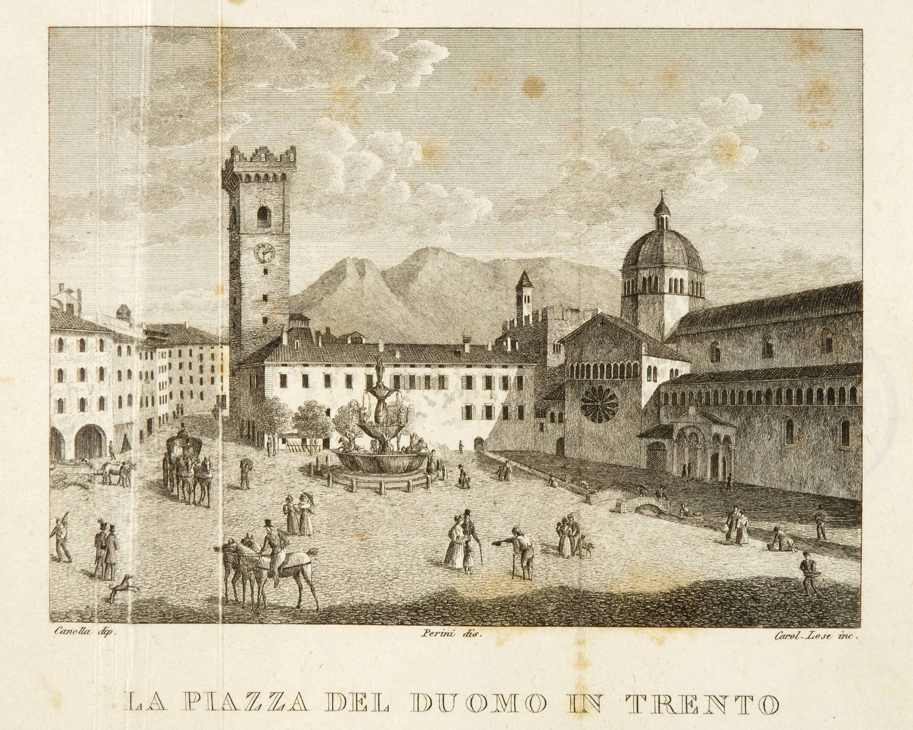 Calcografia; 101x137 mm. Disegno di Agostino Perini da un dipinto di Giuseppe Canella, incisione di Carolina Lose, pubblicata in Giuseppe Pinamonti, Trento sue vicinanze ..., Trento, Marietti, 1836