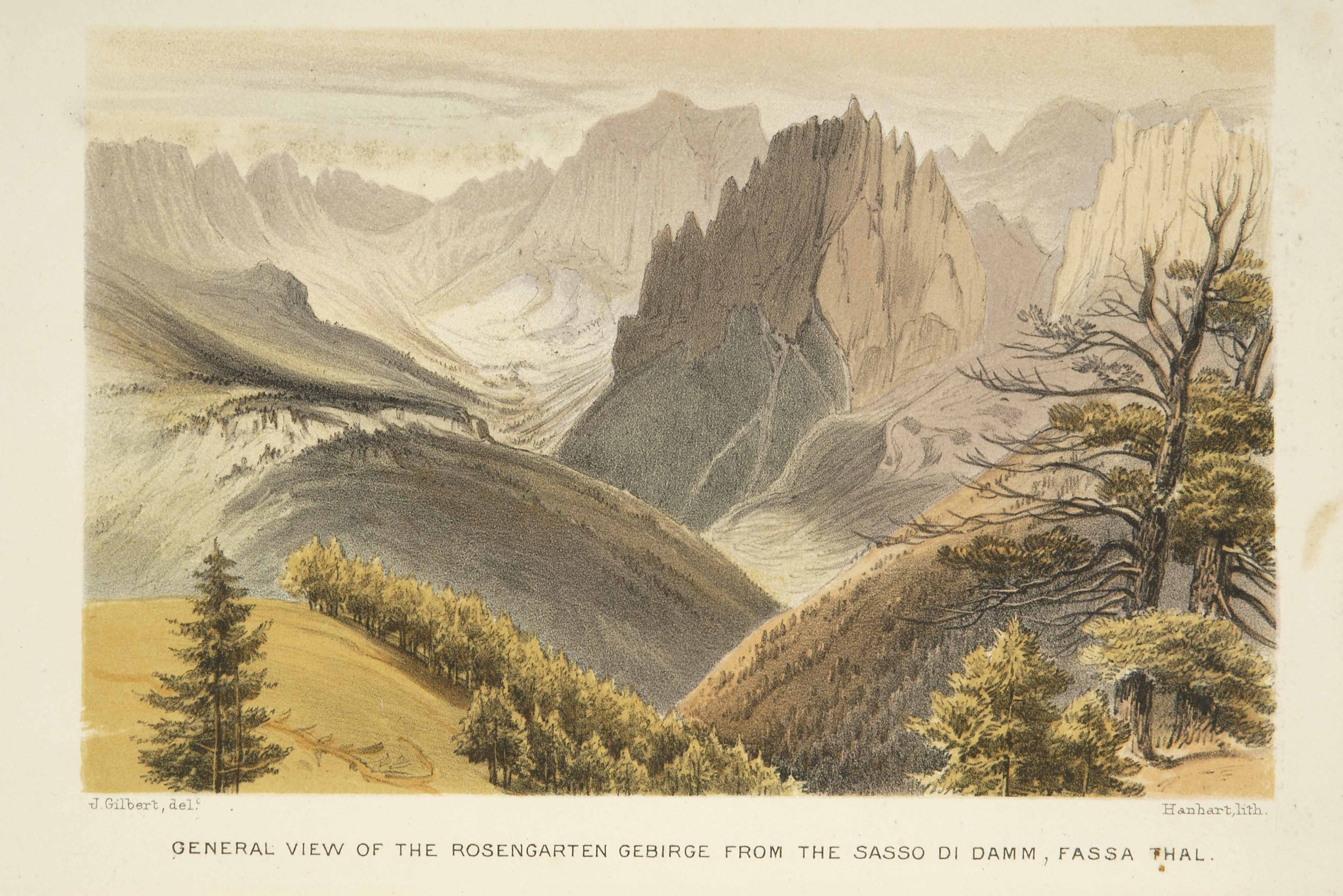 Litografia; 101x158 mm, su foglio 136x210 mm. Disegno di Josiah Gilbert, litografia di Michael e Nicholas Hanhart, pubblicata in Josiah Gilbert e George Cheetham Churchill, The Dolomite mountains. Excursions through Tyrol, Carinthia, Carniola &, Friuli in 1861, 1862 &, 1863, London, Longman &, Co., 1864