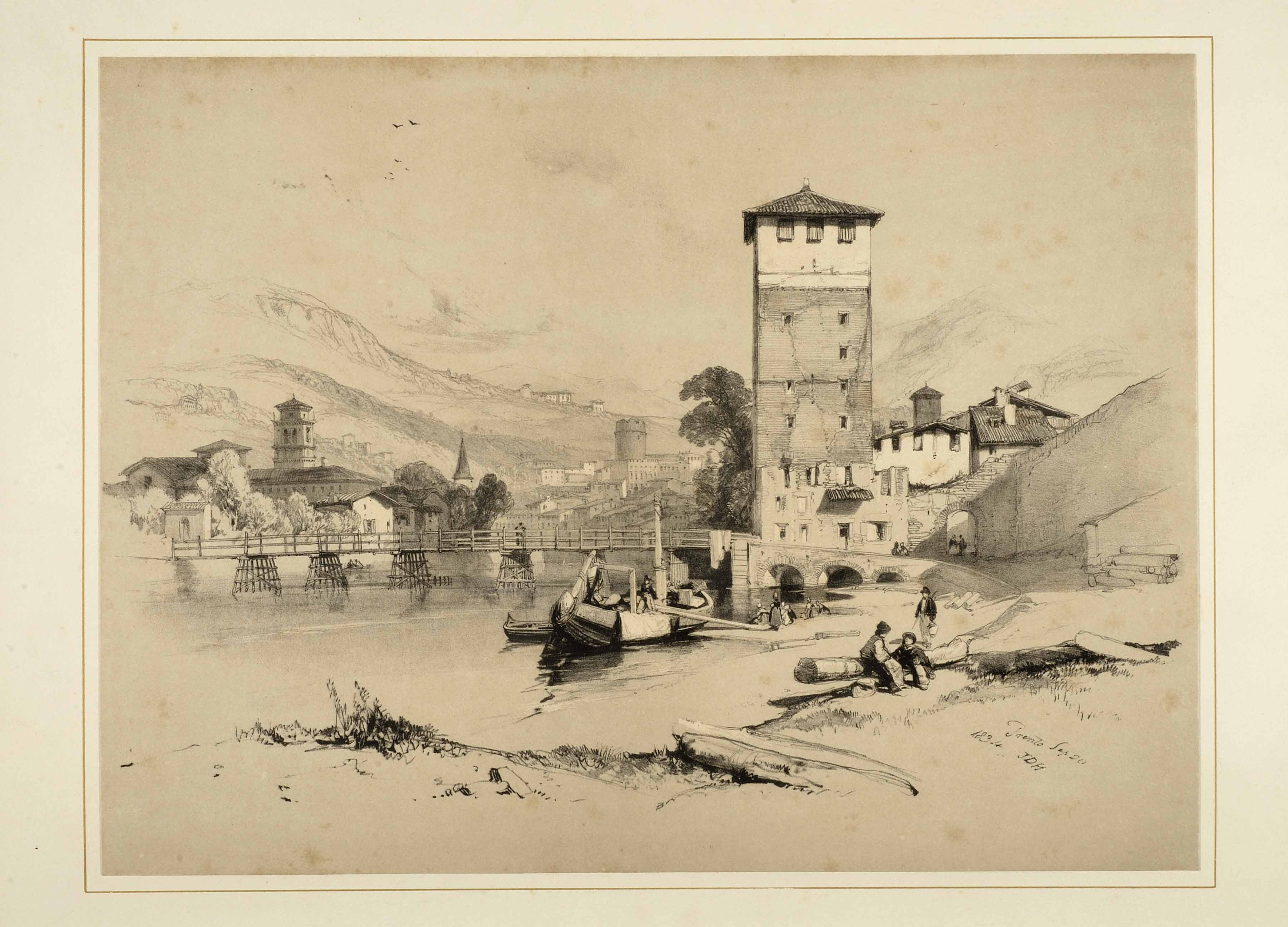 Litografia; 283x378 mm, 415x577 mm. Disegno di James Duffield Harding, litografia di Charles Joseph Hullmandel, pubblicata da Charles Tilt a Londra nel 1836. Cfr. Aldo Chemelli, Carlo Perini, Marcus Perini, Trento illustrata. La città e il territorio in piante e vedute dal XVI al XX secolo, Padova, Studio editoriale Programma, 1991, pp. 34-35, 190