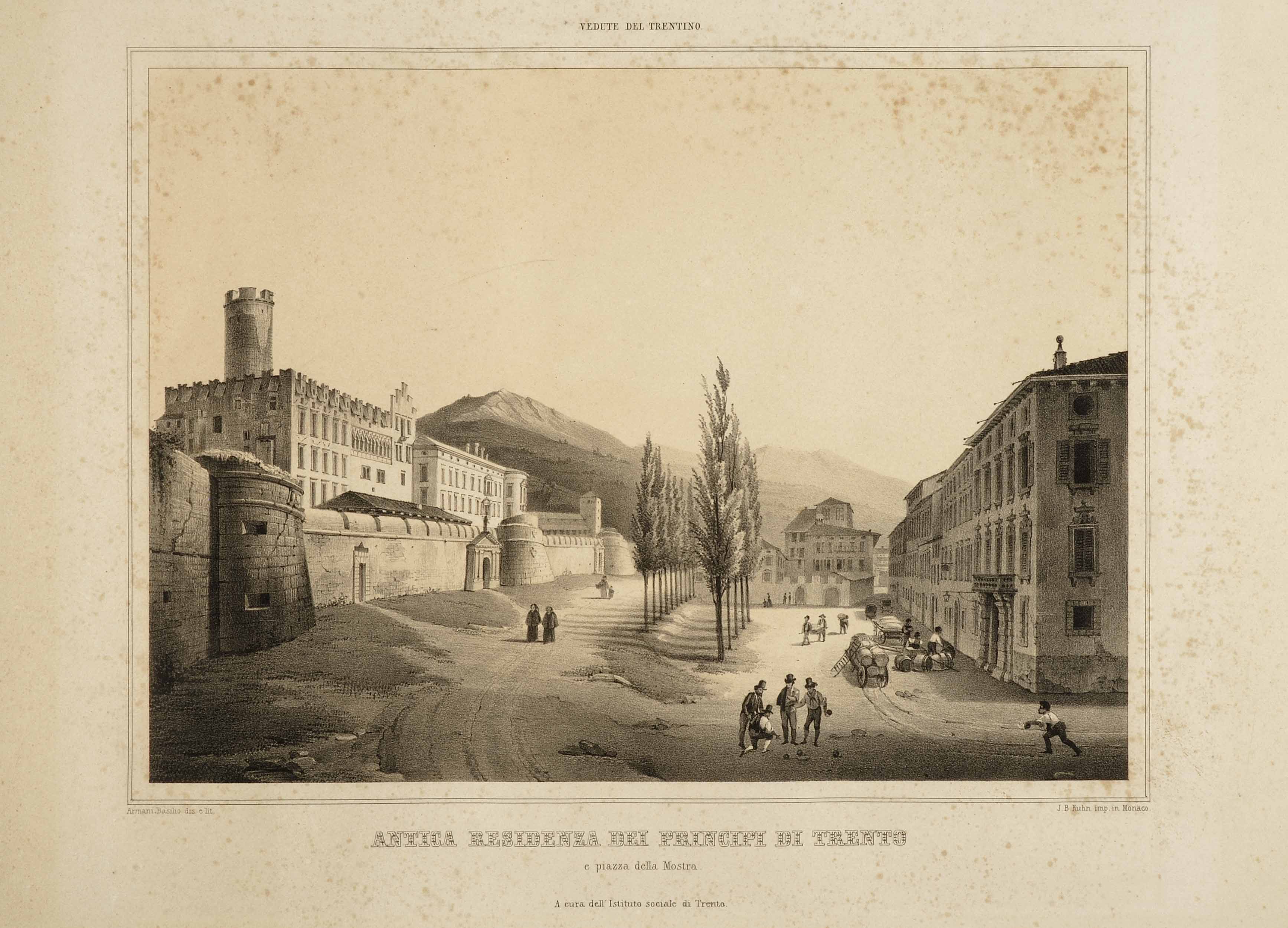 Litografia; 217x298 mm, su foglio 390x578 mm. Date di pubblicazione da Aldo Chemelli, Trento nelle stampe d'arte, Trento, Provincia autonoma di Trento, Ufficio beni librari e archivistici, 1990, p. 264