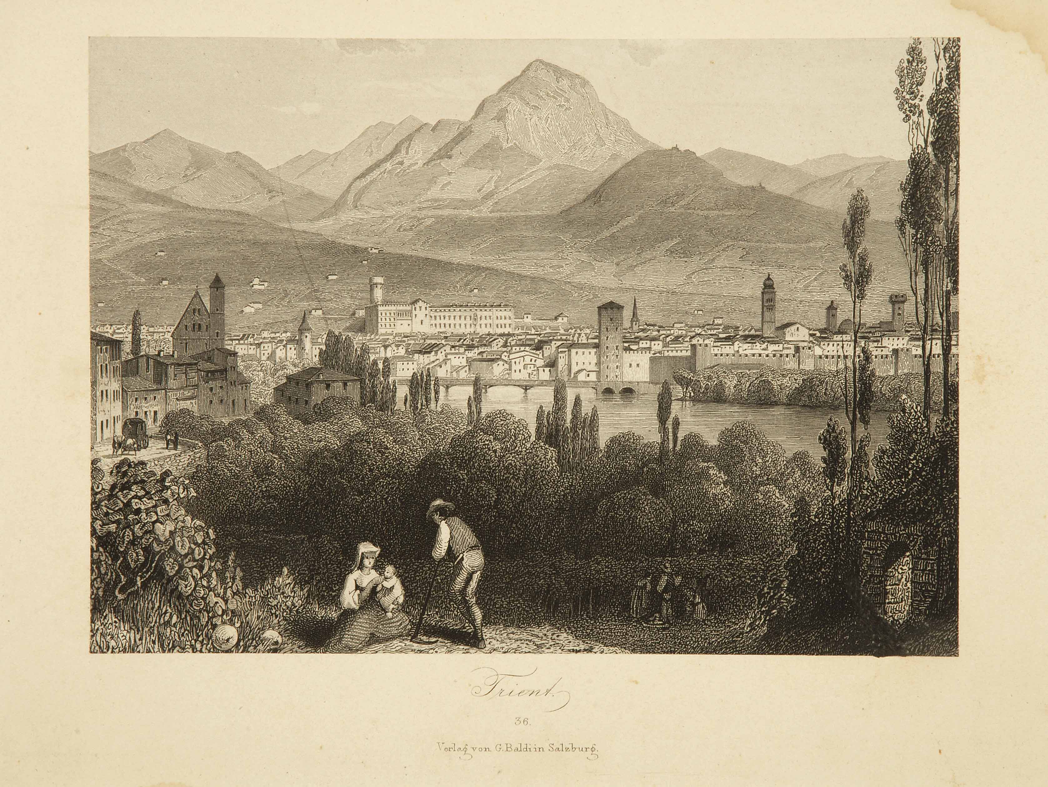 Calcografia, 111x156 mm. Disegno e incisione di Friedrich Würthle, pubblicata tra il 1852 e il 1855 da G. Baldi a Salisburgo cfr. Aldo Chemelli, Trento nelle stampe d'arte, Trento, Provincia autonoma di Trento, Ufficio beni librari e archivistici, 1990, p. 242