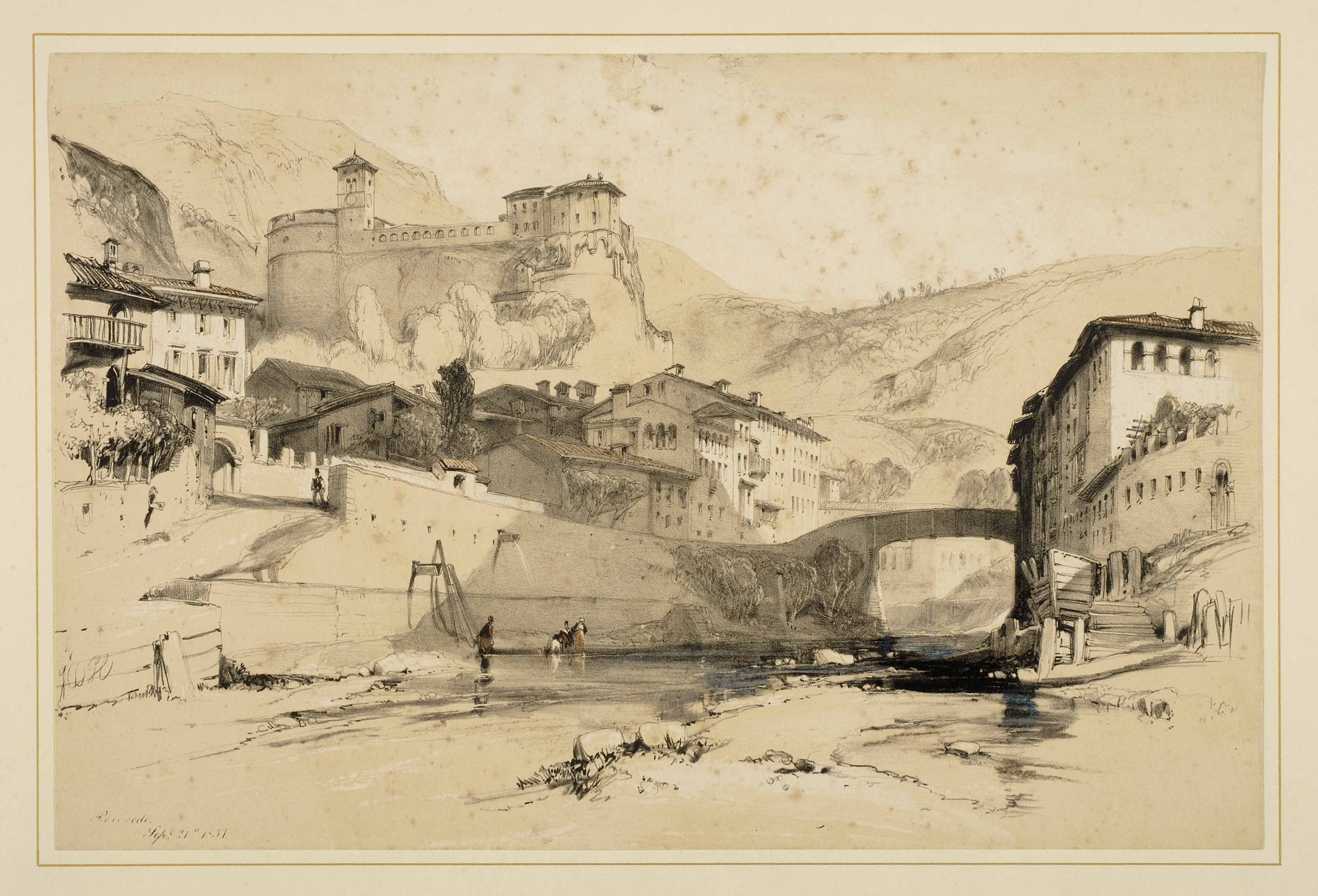Litografia; 249x376 mm, su foglio 415x558 mm . Disegno di James Duffield Harding, litografia di Charles Joseph Hullmandel, pubblicata da Charles Tilt a Londra nel 1836. Cfr. Brunamaria Dal Lago Veneri, Arnaldo Loner, Il Trentino-Alto Adige, immagini dal passato, Roma, Newton Compton, 1986, pp. 240-241