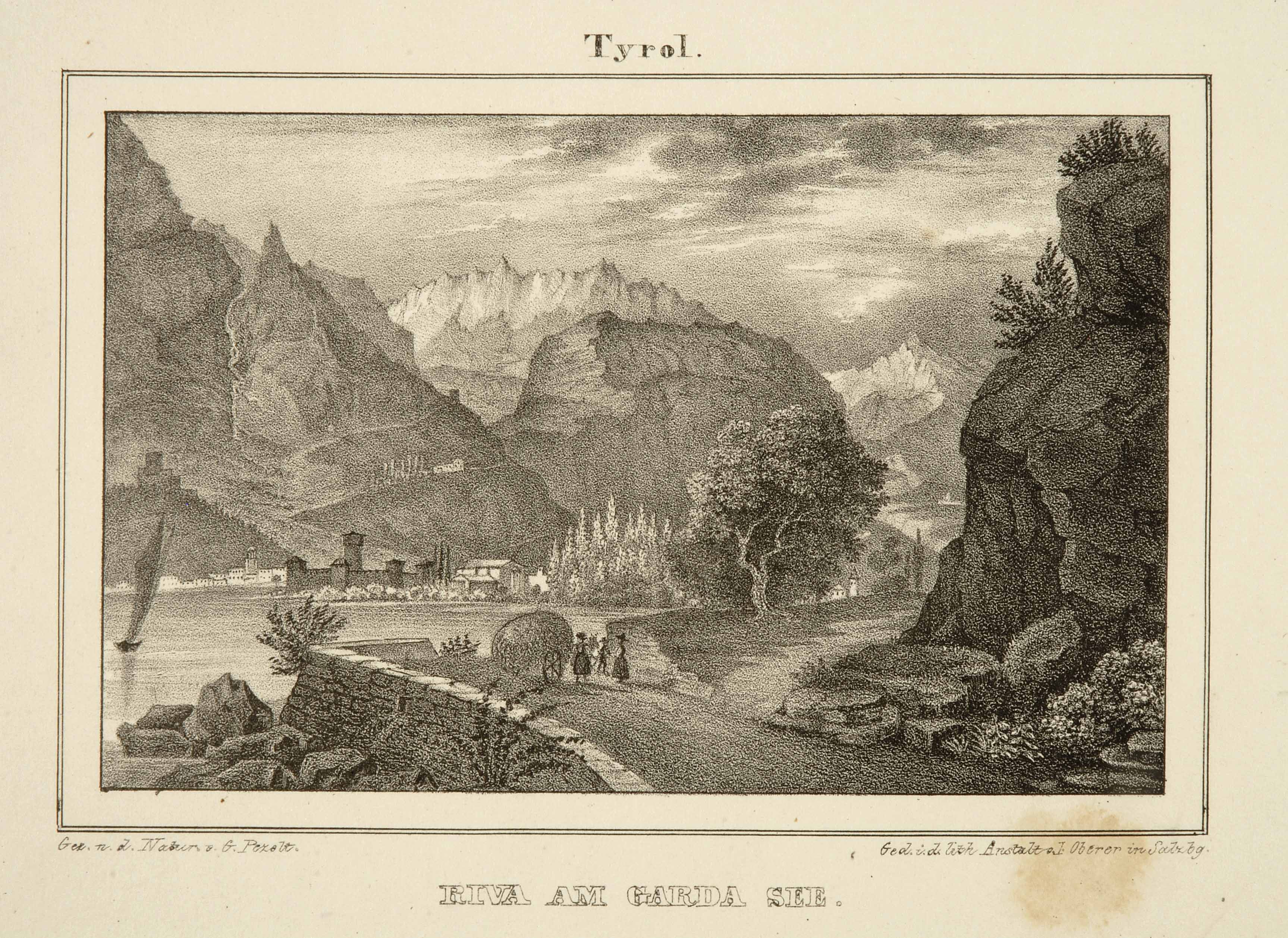 Litografia; 97x152 mm. Disegno di Georg Pezolt, pubblicata probabilmente tra il 1830 e il 1840 (cfr. Ugo Spini, Tebaldo Sinistri, Il Garda nelle sue stampe, Brescia, Grafo, 2000, p. 91)