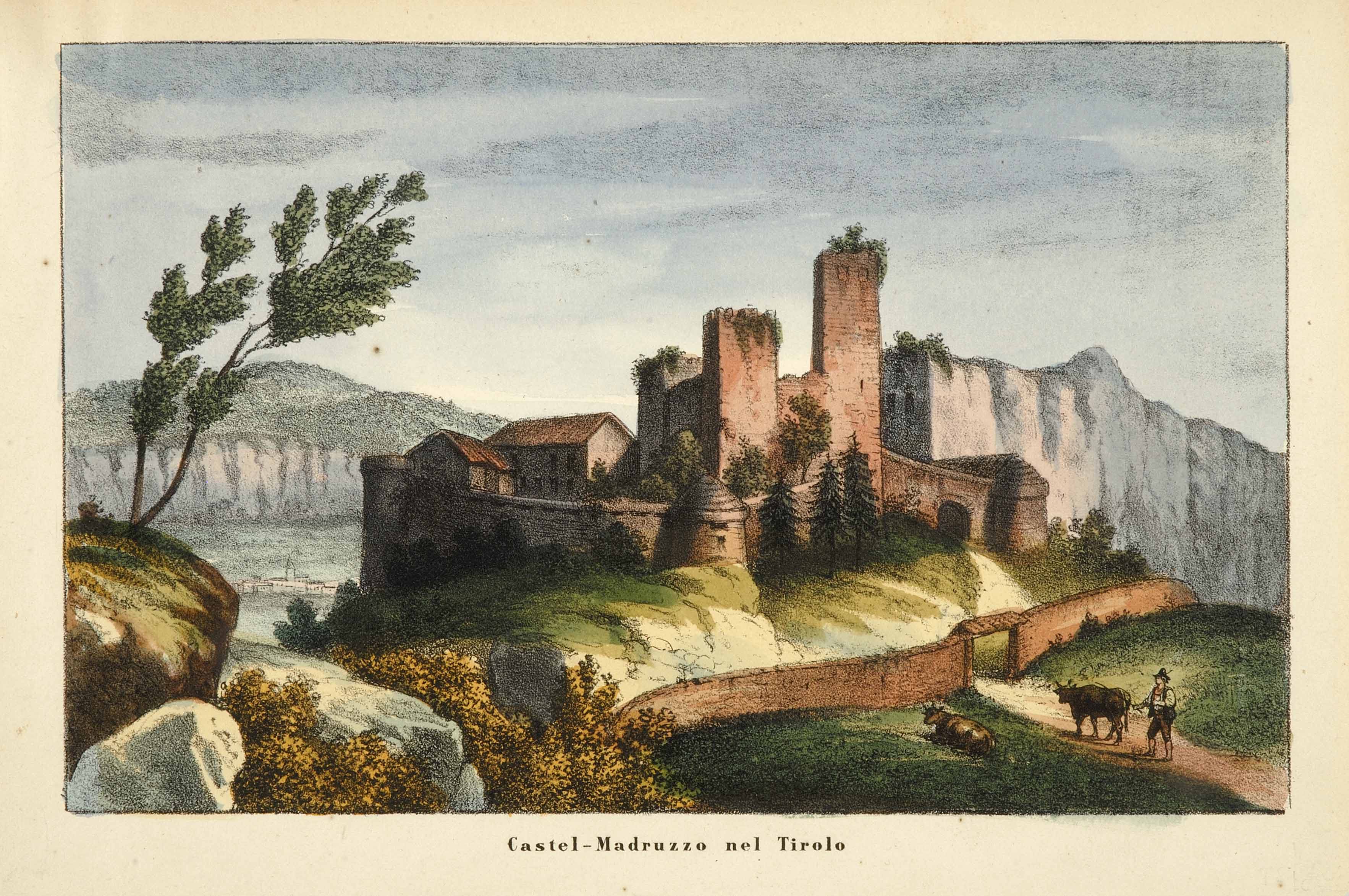 Calcografia; 156x247 mm, su foglio 196x290 mm . Disegno di Agostino Perini, pubblicata probabilmente contemporaneamente all'analoga calcografia presente in Agostino Perini, I castelli del Tirolo colla storia delle relative antiche potenti famiglie, Milano, Pirrotta, a spese di Giuseppe Antonio Marietti, 1834-1839