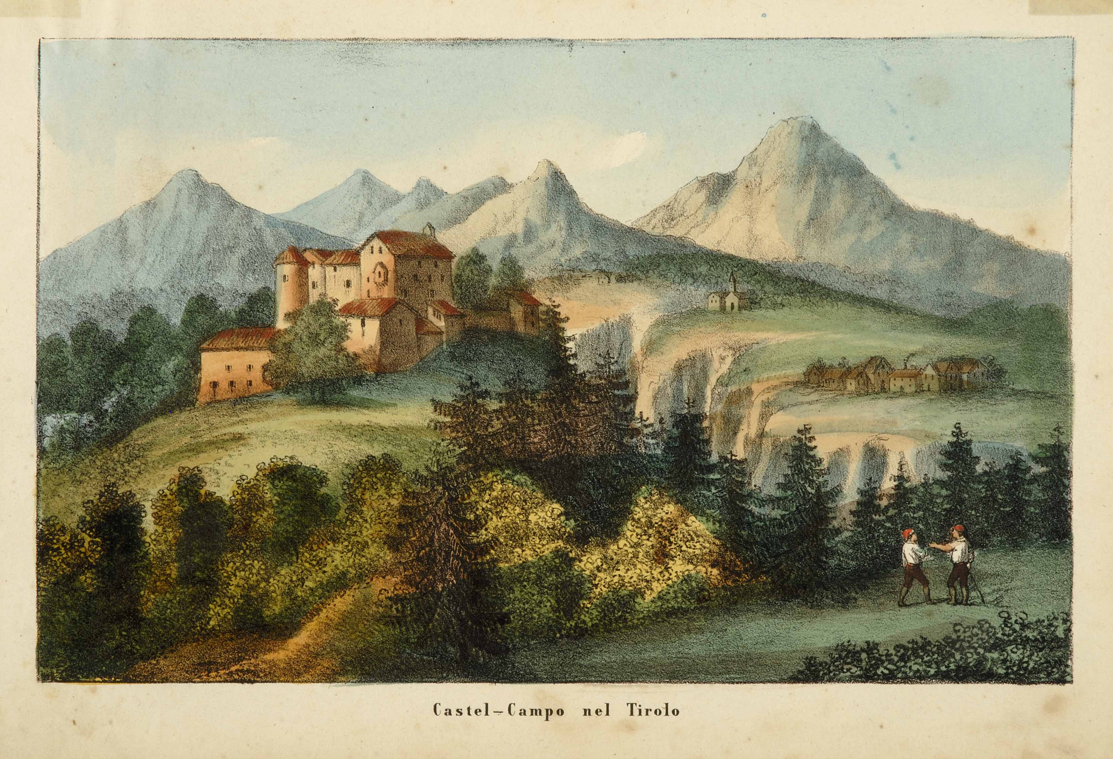 Calcografia; 156x247 mm, su foglio 196x290 mm. Disegno di Agostino Perini, pubblicata probabilmente contemporaneamente all'analoga calcografia presente in Agostino Perini, I castelli del Tirolo colla storia delle relative antiche potenti famiglie, Milano, Pirrotta, a spese di Giuseppe Antonio Marietti, 1834-1839