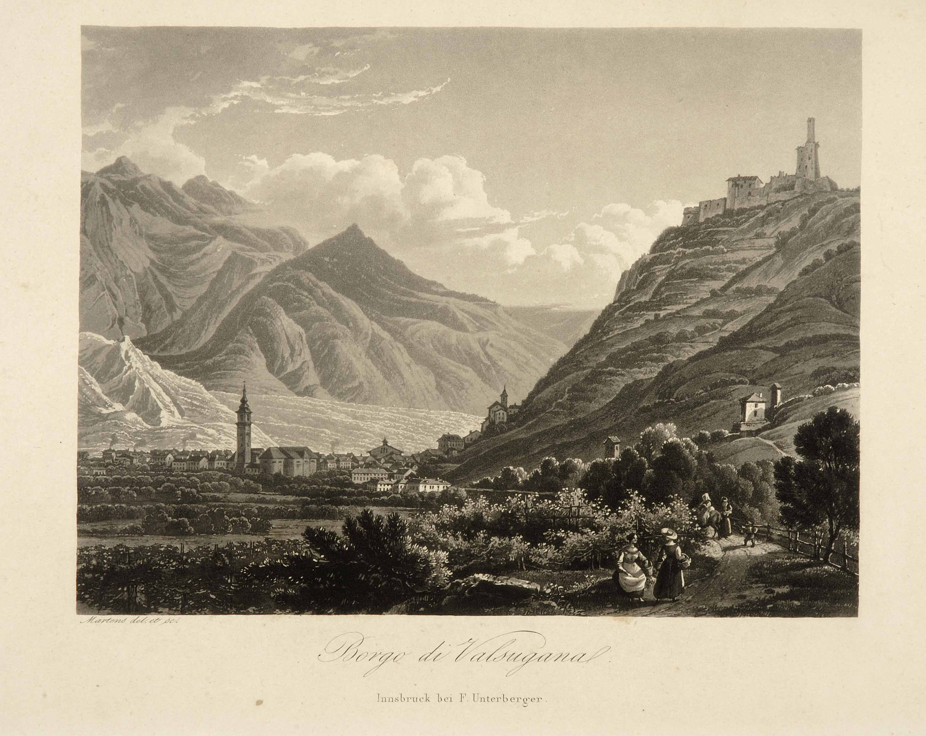 Calcografia; 145x195 mm, 206x290 mm. Pubblicata attorno al 1840, data di pubblicazione da Aldo Chemelli, Carlo Perini, Marcus Perini, Trento illustrata. La città e il territorio in piante e vedute dal XVI al XX secolo, Padova, Studio editoriale Programma, 1991, p. 176
