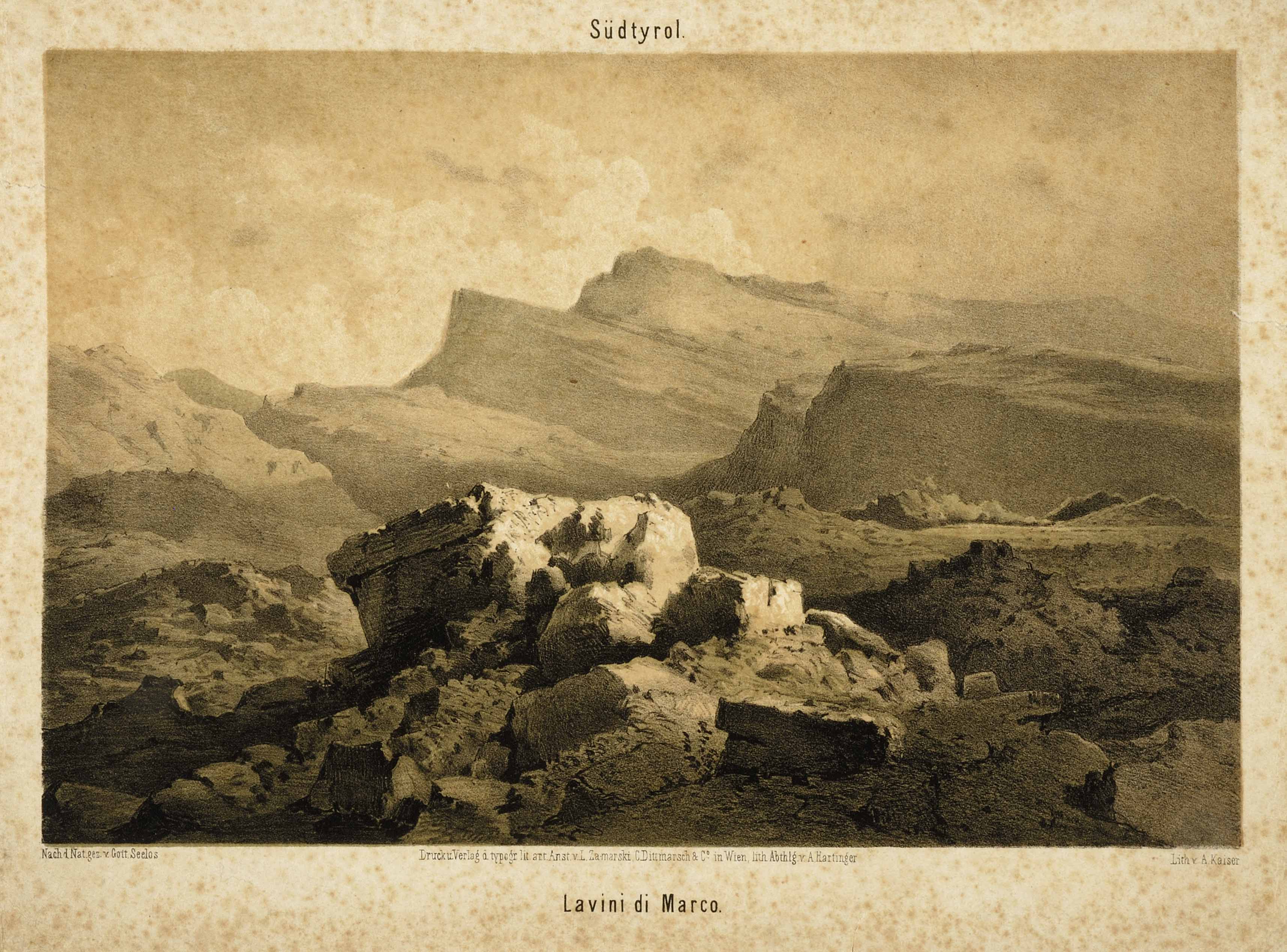 Litografia; 166x248 mm, su foglio 216x275 mm. Disegno di Gottfried Seelos, litografia di Alexander Kaiser, pubblicata in Zur Erinnerung an die Eröffnung der Eisenbahnstrecke von Verona nach Bozen im Jahre 1859, Wien, Zamarski e Dittschmarsch, 1859