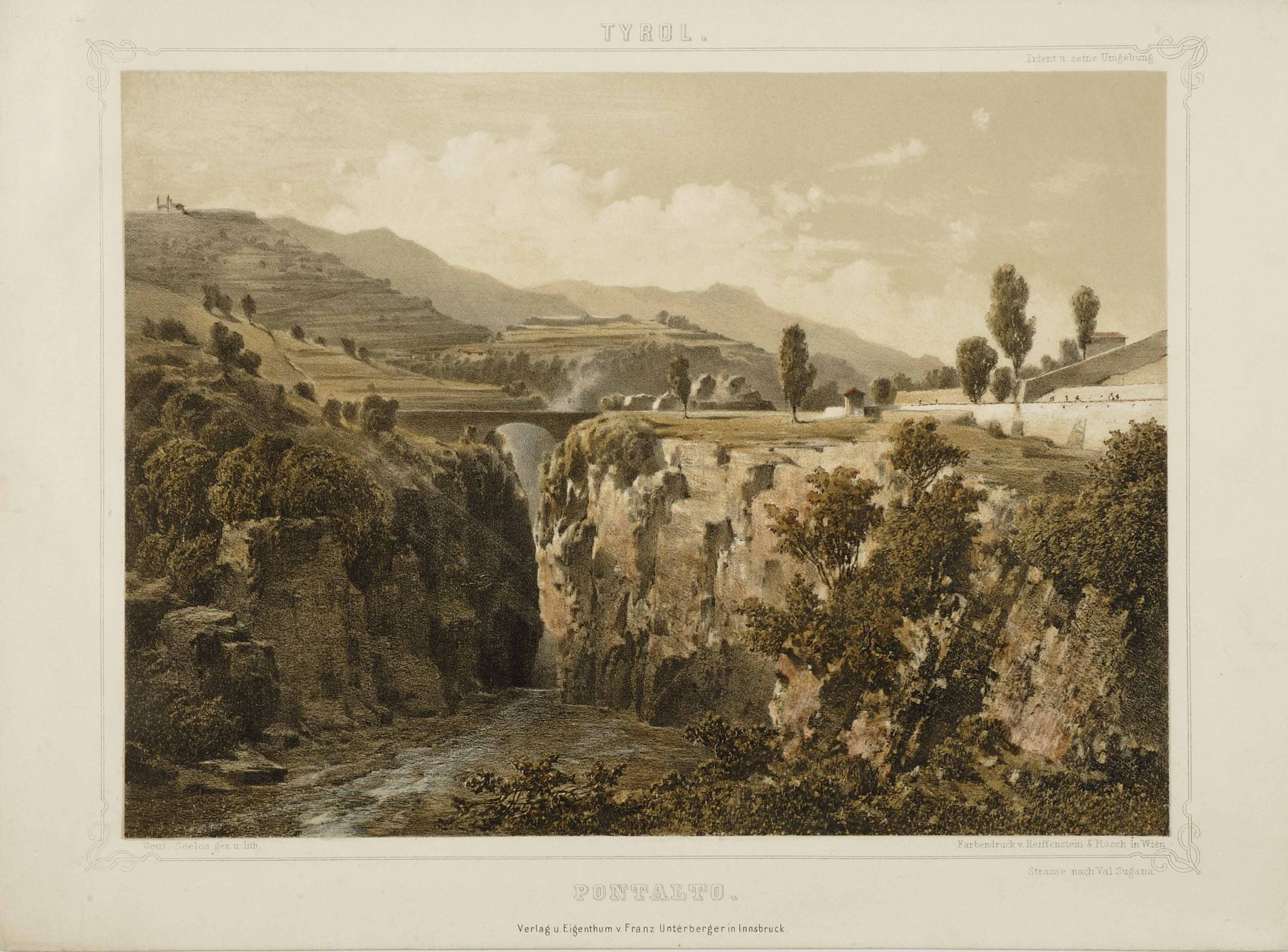 Litografia; 215x294 mm, su foglio 270x367. Disegno e litografia di Gottfried Seelos, data di pubblicazione da Brunamaria Dal Lago Veneri, Arnaldo Loner, Il Trentino-Alto Adige, immagini dal passato, Roma, Newton Compton, 1986, p. 208