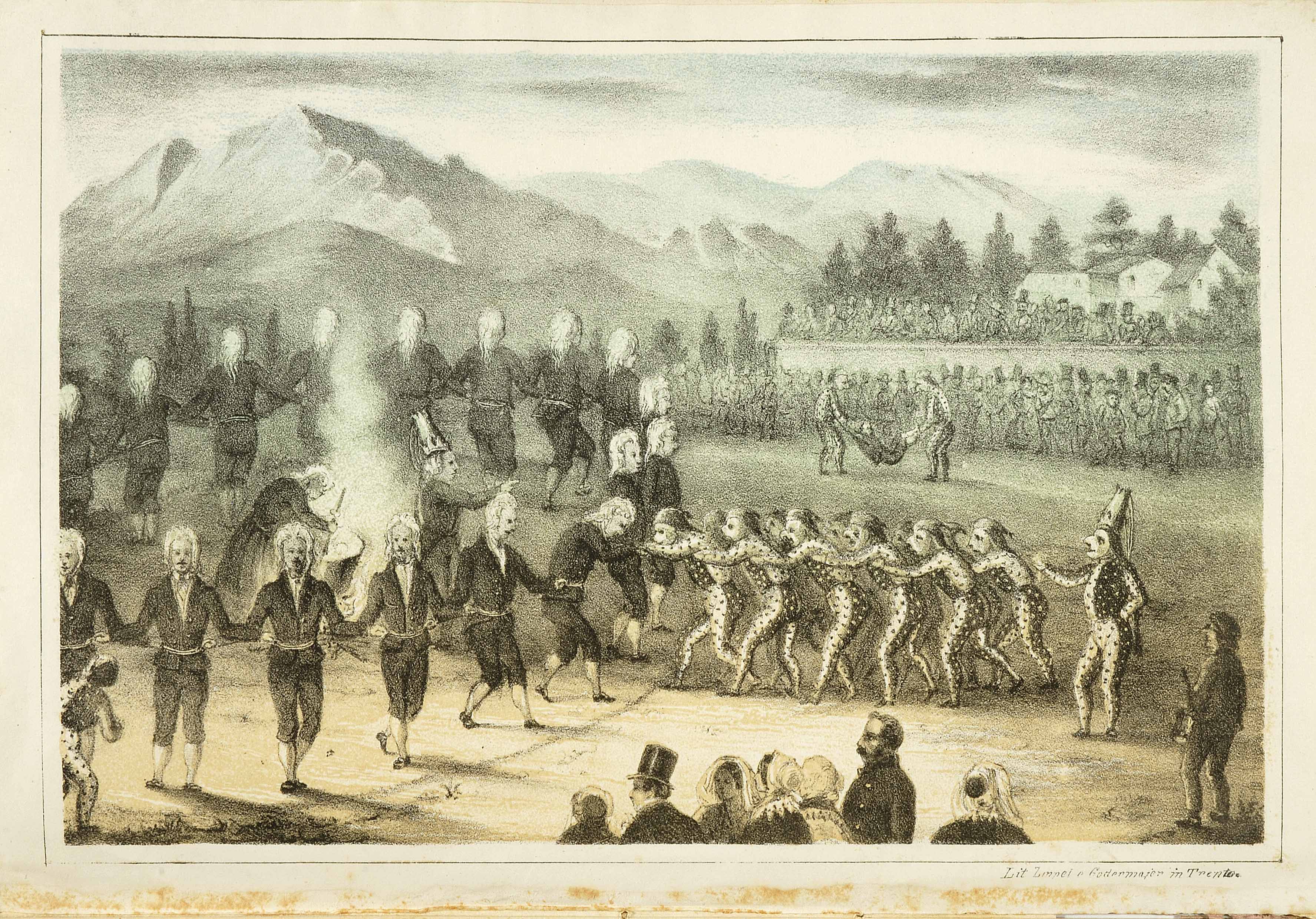 Litografia; 132x199 mm, su foglio 155x227 mm. Litografia di Zippel e Godermaier, titolo formulato dal catalogatore, pubblicata in Tito Bassetti, Sulla antica mascherata trentina detta la polenta dei Ciusi-Gobj, Trento, Monauni, 1858
