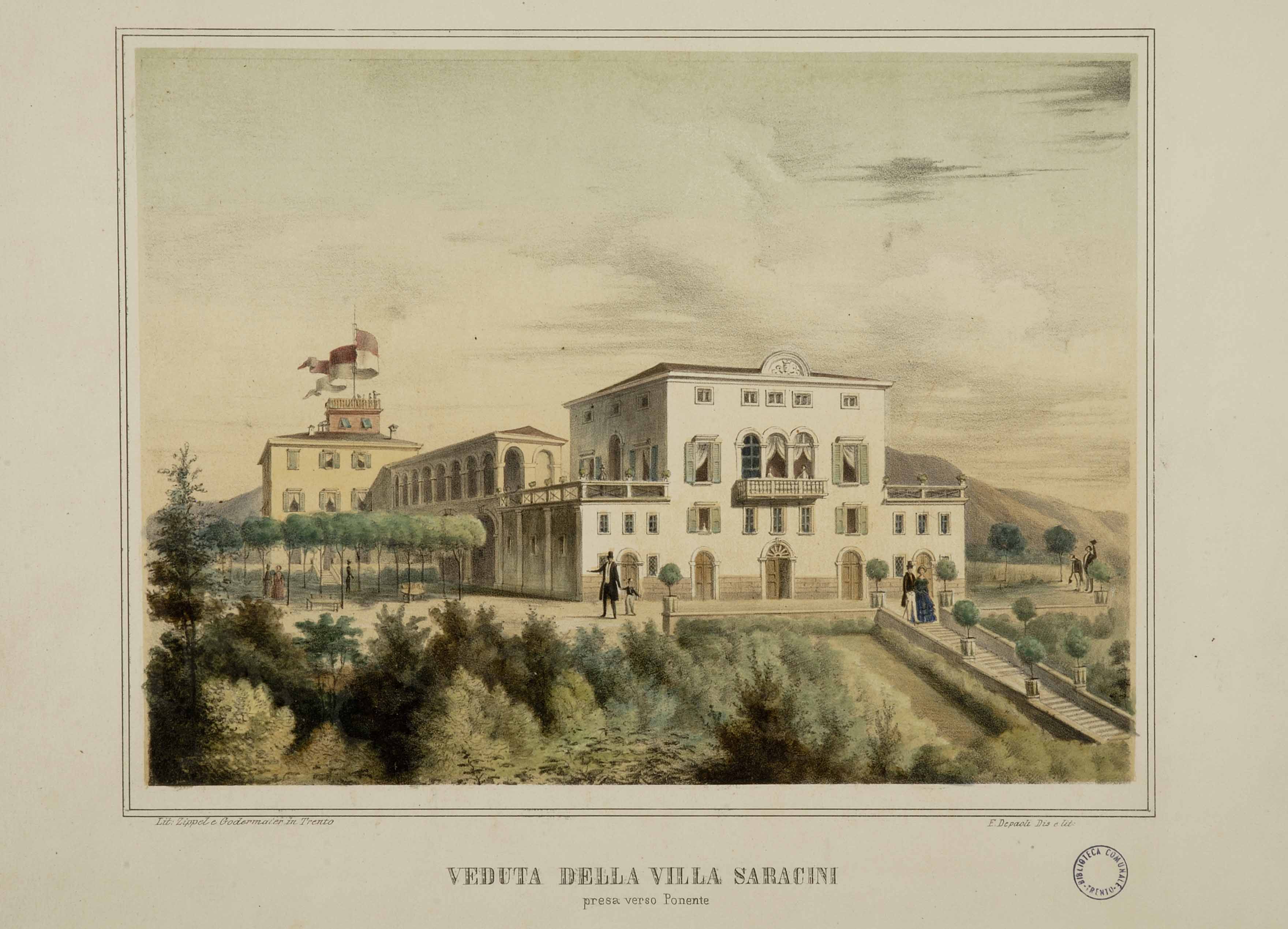 Litografia; 203x274 mm, su foglio 316x428 mm. Disegno e litografia di Fortunato Depaoli, pubblicata in La villa Saracini situata nel comune di Povo, Trento, Seiser, 1858