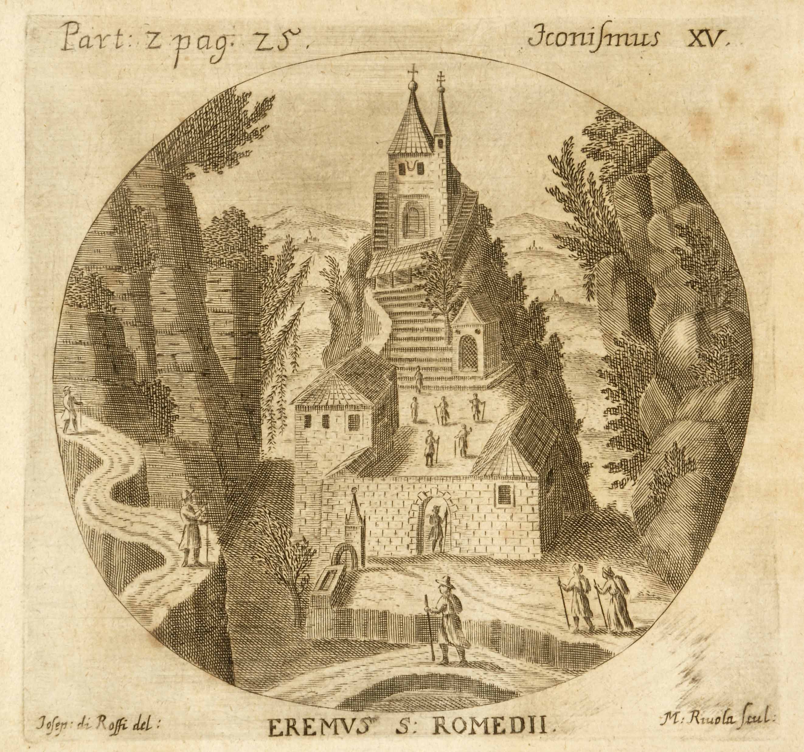 Calcografia; 126x131 mm. Disegno di Giuseppe de Rossi, incisione di Michael Rivola, pubblicata in Amando Friedenfels, Ectypon sumptuosae ac magnificae capellae s. Romedii... Praha, Collegium Sancti Norberti, Georg Samuel Beringer, 1699