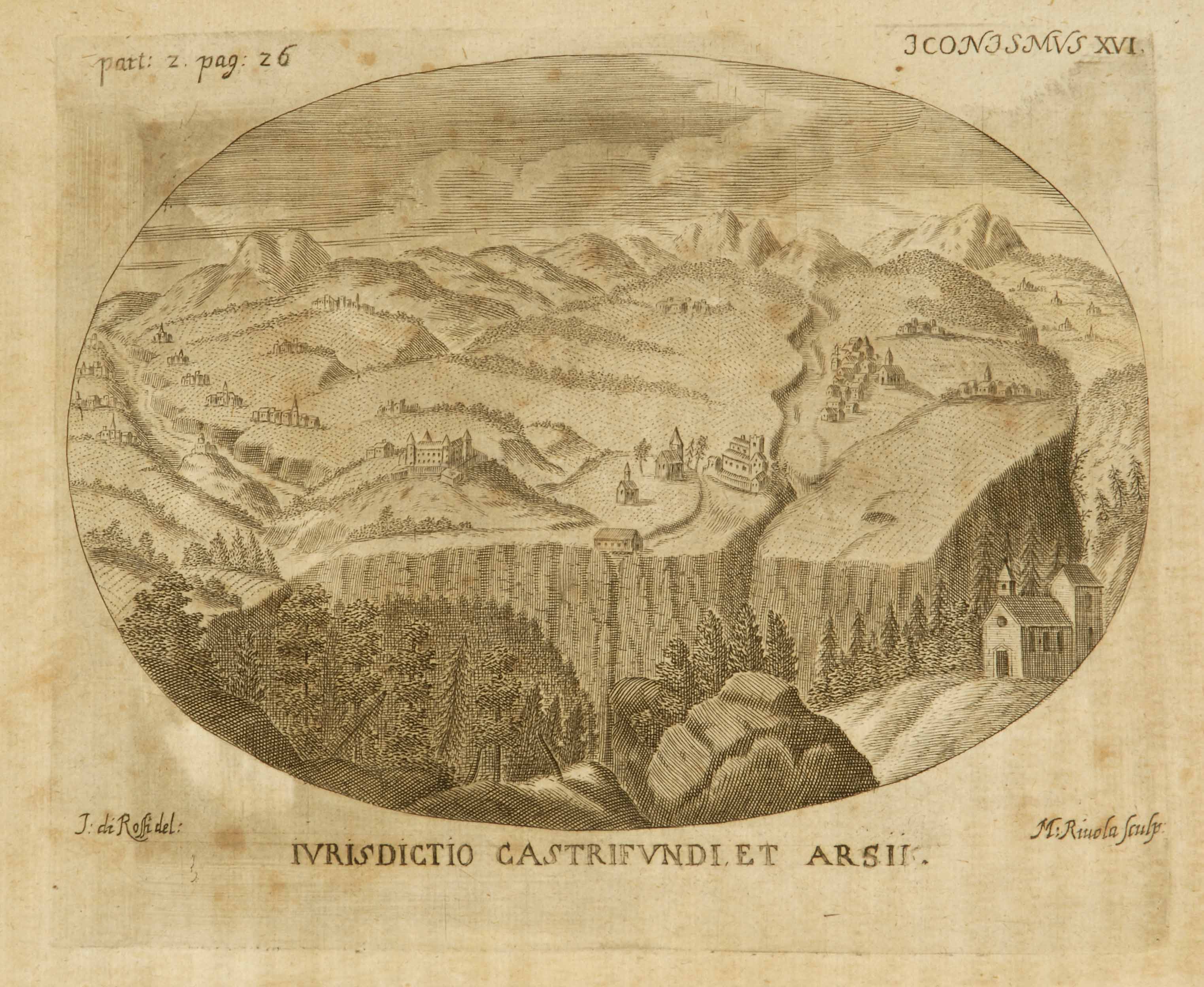 Calcografia; 146x173 mm. Disegno di Giuseppe de Rossi, incisione di Michael Rivola, pubblicata in Amando Friedenfels, Ectypon sumptuosae ac magnificae capellae s. Romedii... Praha, Collegium Sancti Norberti, Georg Samuel Beringer, 1699