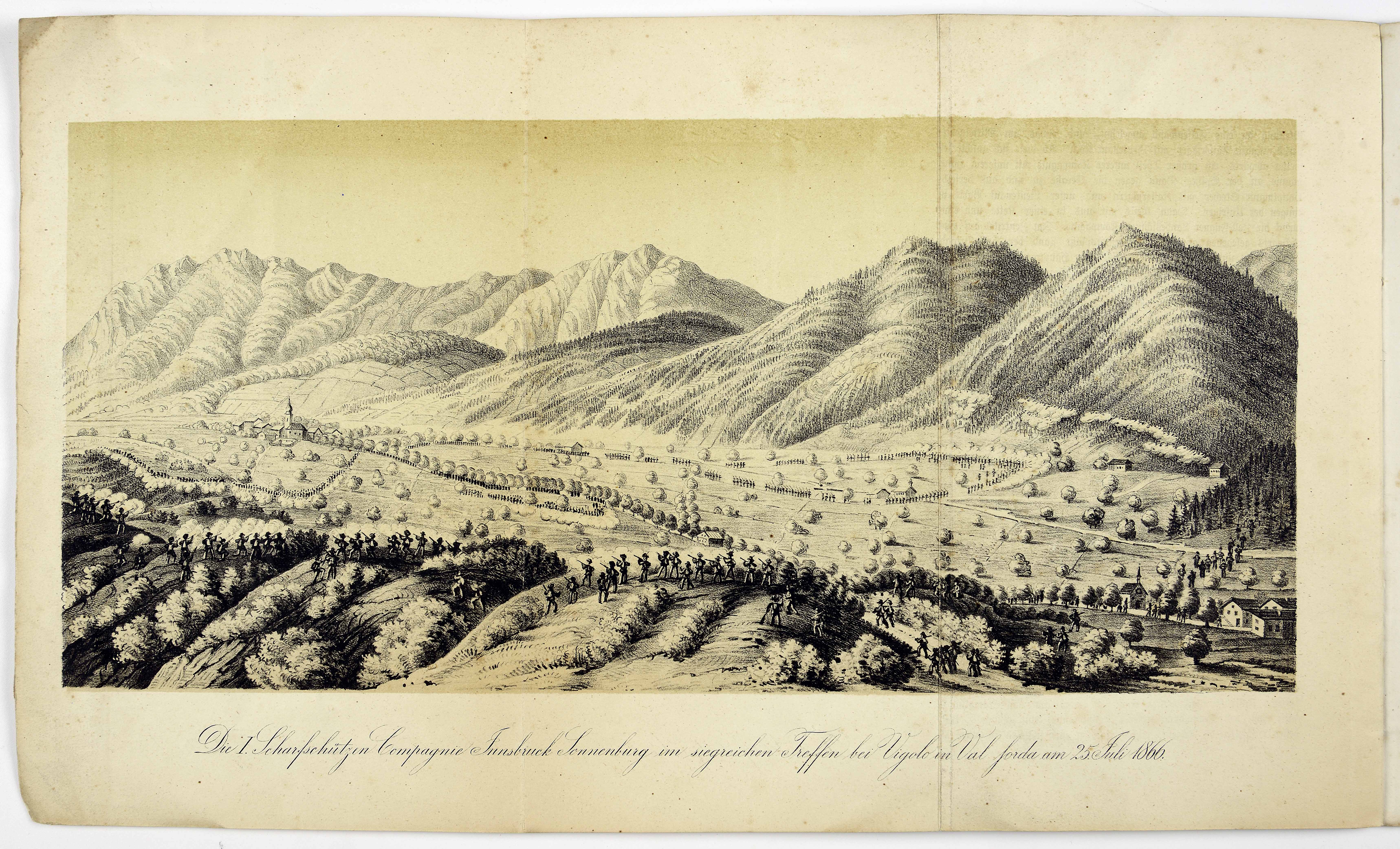 Litografia; 167x362 mm. Pubblicata in Erlebnisse der ersten freiwilligen Scharf-Schützen-Kompagnie Innsbruck-Sonnenburg 1866, Innsbruck, Vereins-Buchdruckerei, 1867