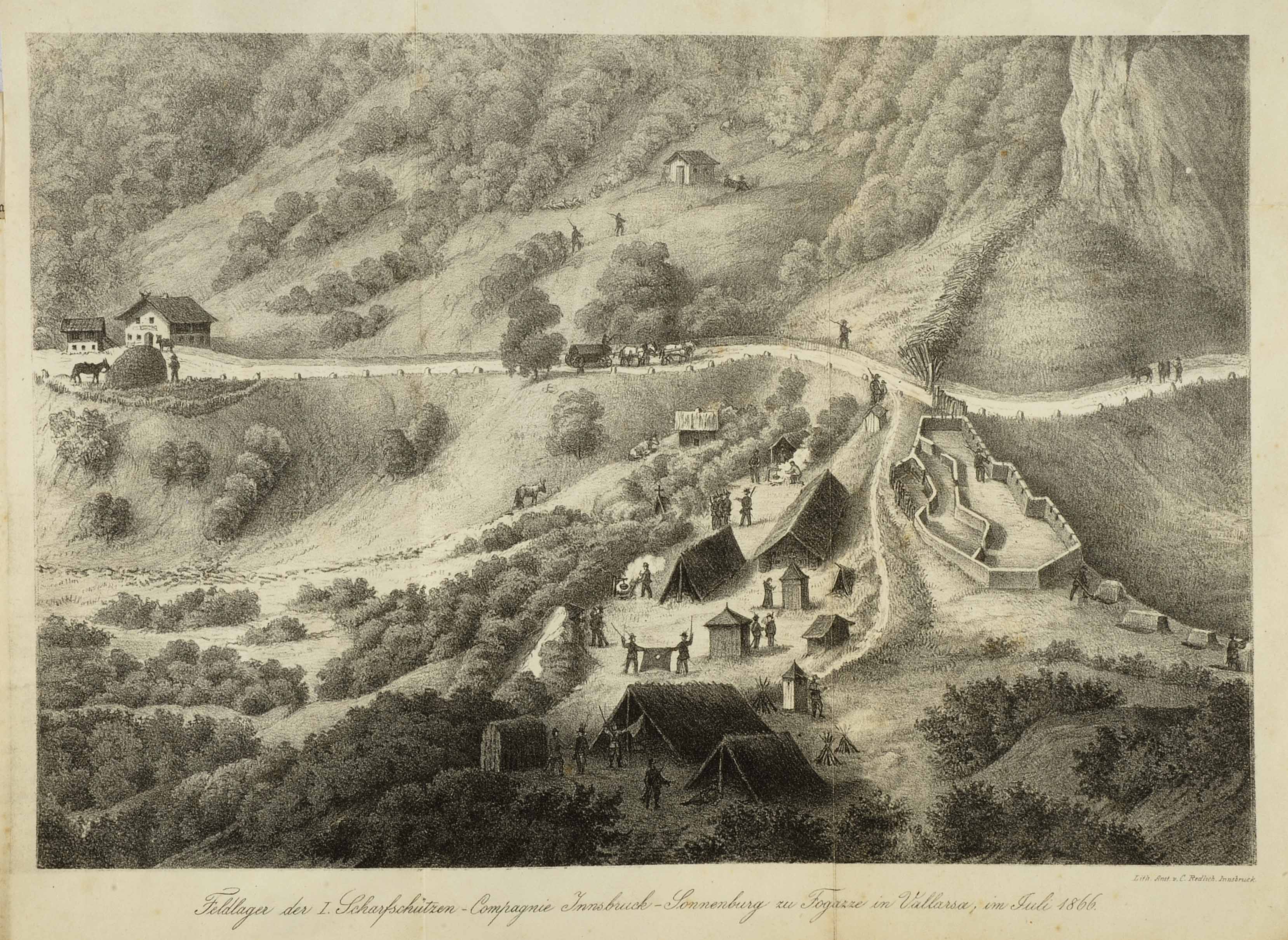 Litografia; 227x332 mm. Litografia di Carl Redlich, pubblicata in Erlebnisse der ersten freiwilligen Scharf-Schützen-Kompagnie Innsbruck-Sonnenburg 1866, Innsbruck, Vereins-Buchdruckerei, 1867