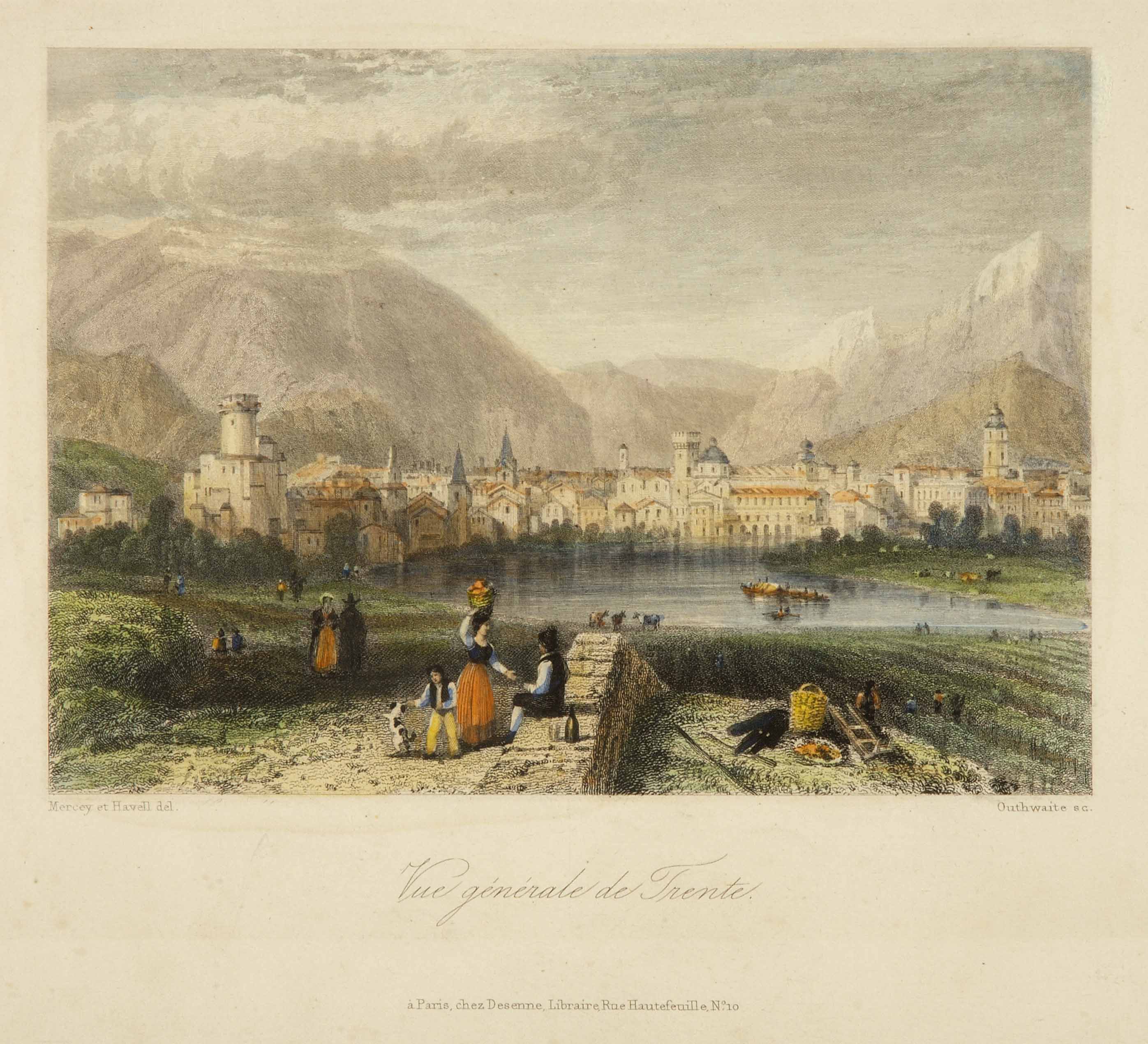 Calcografia; 105x147 mm, 275x177 mm. Disegno di Frédéric Mercey e Robert Havell, incisione di Jean Jacques Outhwaite, pubblicata in Frédéric Mercey, Histoire et description des principales villes de l'Europe. Tyrol. Trente, Paris, Desenne, 1835