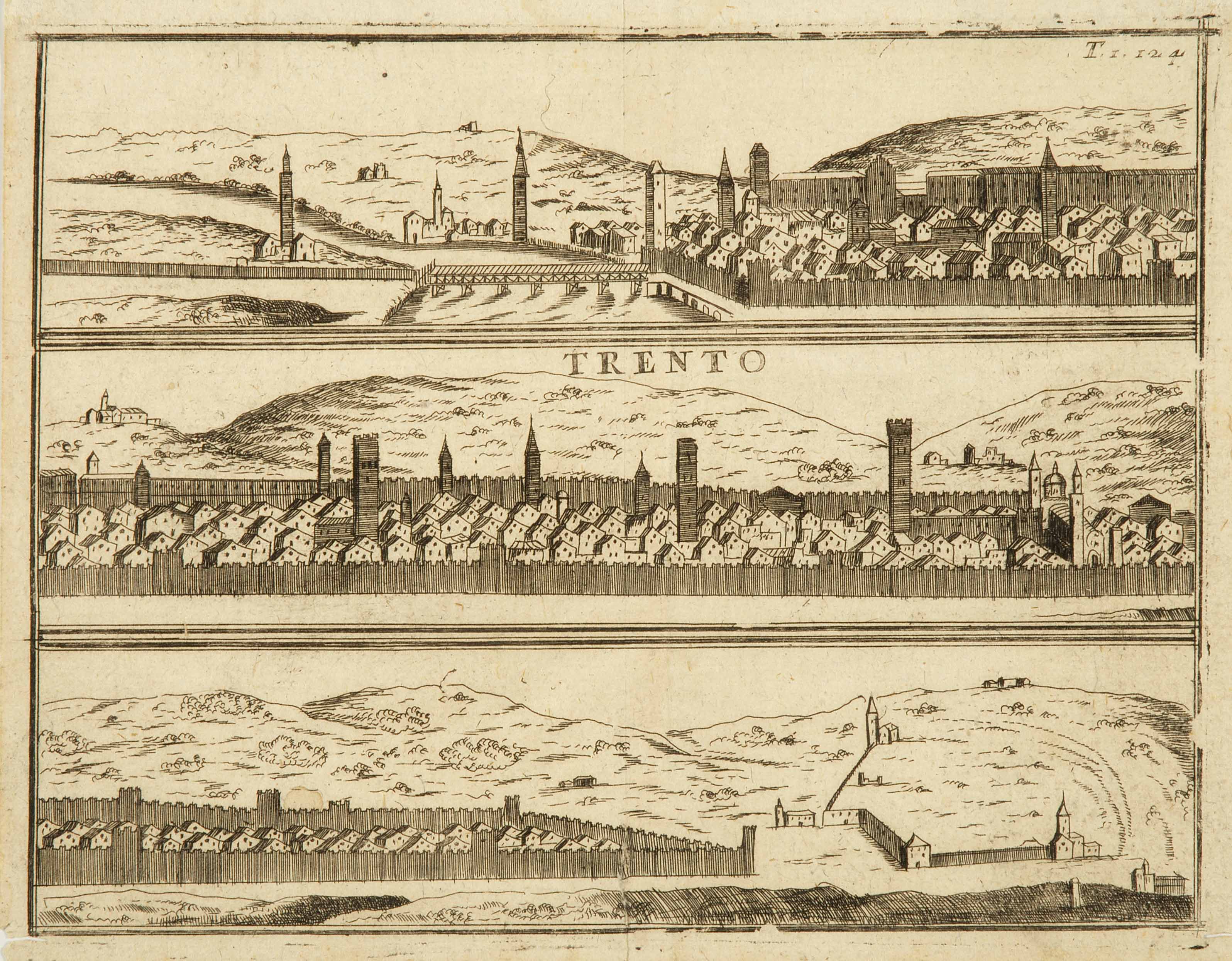 Calcografia; 145x189 mm. Attribuita a Vincenzo Maria Coronelli, pubblicata a Venezia da Giovanni Battista Tramontin nel 1697 e dalla Tipografia dei Frari nel 1709. Cfr. Franco Cappelletti, Imago Tridenti. Incisioni e libri illustrati dal XV al XVIII secolo, Trento, Biblioteca comunale di Trento, 1996, pp. 181-184
