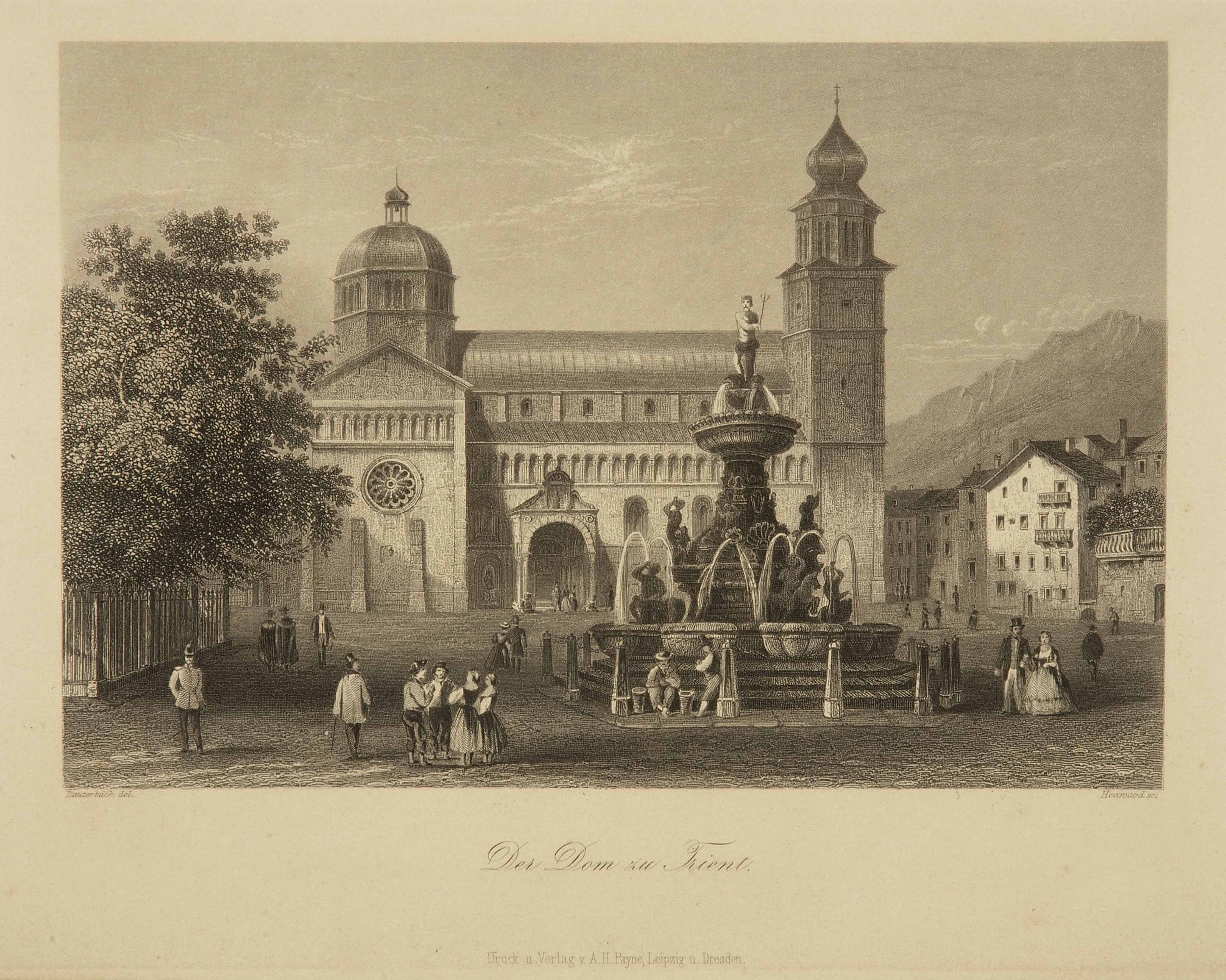Calcografia; 145x216 mm, 200x251 mm. Disegno di Franz Lauterbach, incisione di Thomas Heawood, pubblicata probabilmente intorno al 1880, data di pubblicazione da Aldo Chemelli, Trento. La Piazza del Duomo, Trento, Provincia autonoma di Trento. Giunta, 1997, p. 80