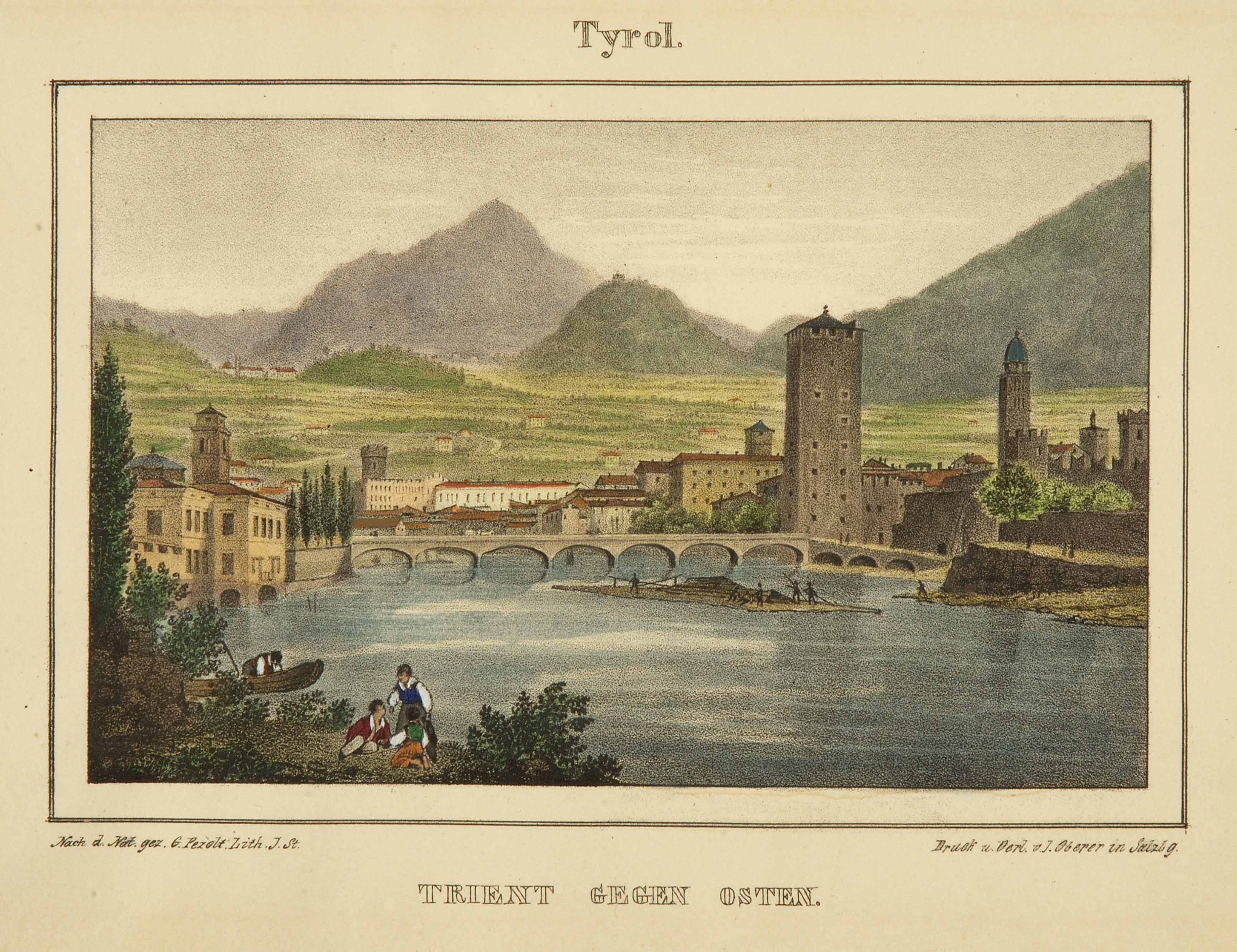 Litografia; 95x150 mm, su foglio 161x205 mm. Disegno di Georg Pezolt, litografia attribuita a Johann Stessberger da Aldo Chemelli, Trento nelle stampe d'arte, Trento, Provincia autonoma di Trento, Ufficio beni librari e archivistici, 1990, p. 240, dal quale si ricavano anche le date di stampa presunte