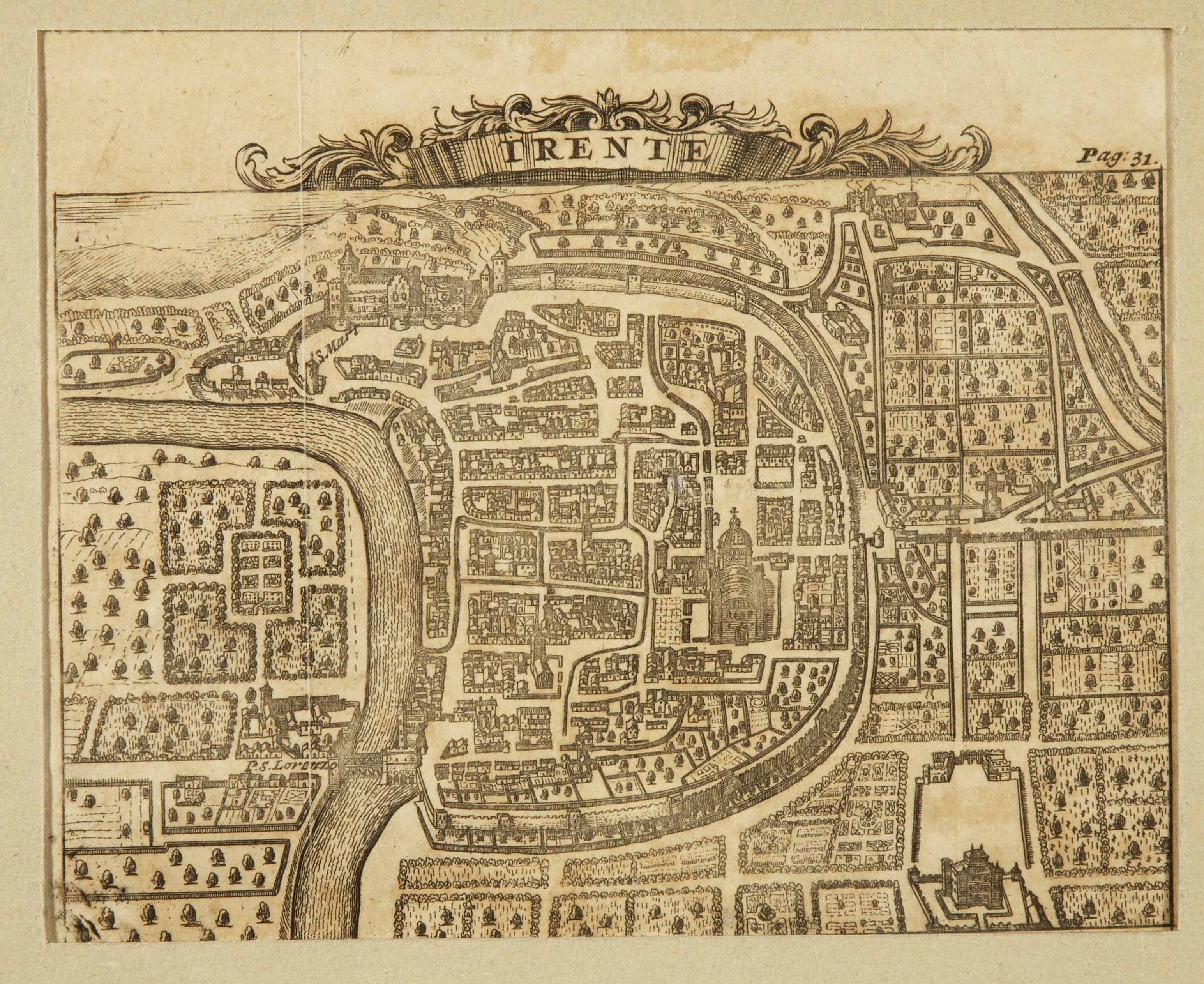 Calcografia; 120x165 mm. Pubblicata a Leiden da Pieter van der Aa. Cfr. Franco Cappelletti, Imago Tridenti. Incisioni e libri illustrati dal XV al XVIII secolo, Trento, Biblioteca comunale di Trento, 1996, pp. 137-138