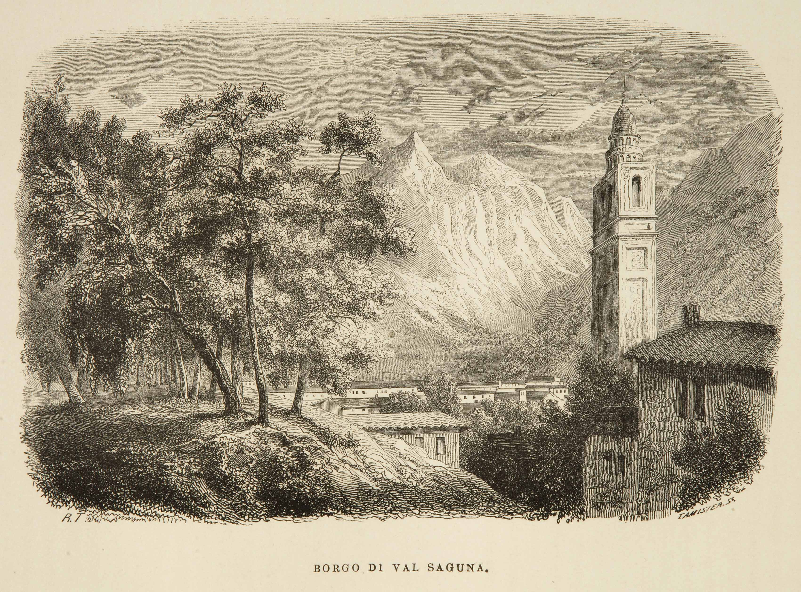Calcografia; 101x155 mm. Incisione sottoscritta: \",Tamisier e R.T.\",, pubblicata in Rodolphe Töpffer, Premiers voyages en zigzag ou excursions d'un pensionnat en vacances dans les Cantons Suisse et sur le revers Italien des Alpes, Paris, Victor Lecou, 1855 e nelle edizioni successive