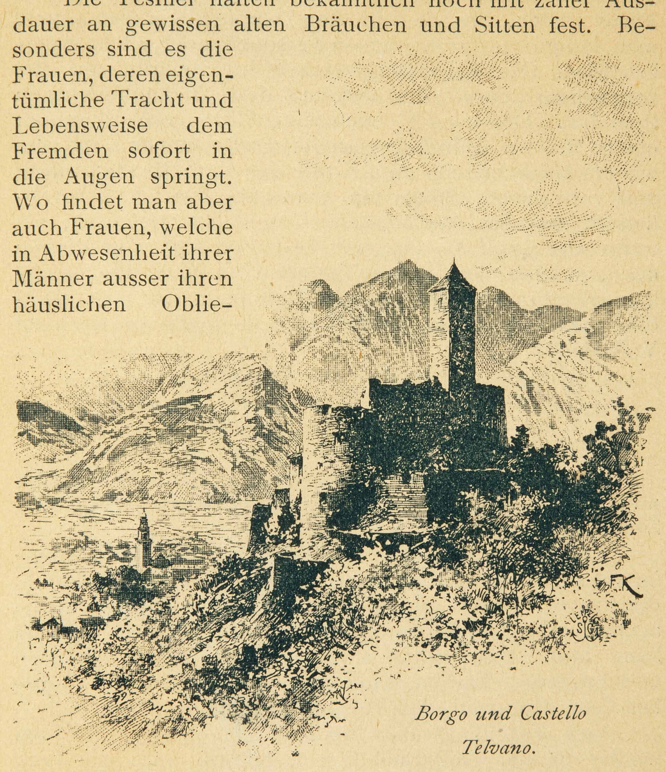 Calcografia; 95x84 mm. Pubblicata in Karl Jülg, Von Trient nach Tezze. Valsuganer Lokalbahn, Salzburg, Fremden-Zeitung, 1896