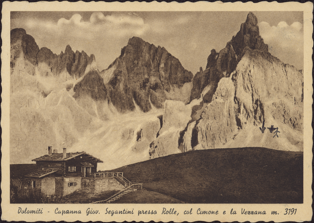 | Dolomiti - Capanna Giov. Segantini presso Rolle, col Cimone e la Vezzana m. 3191 |