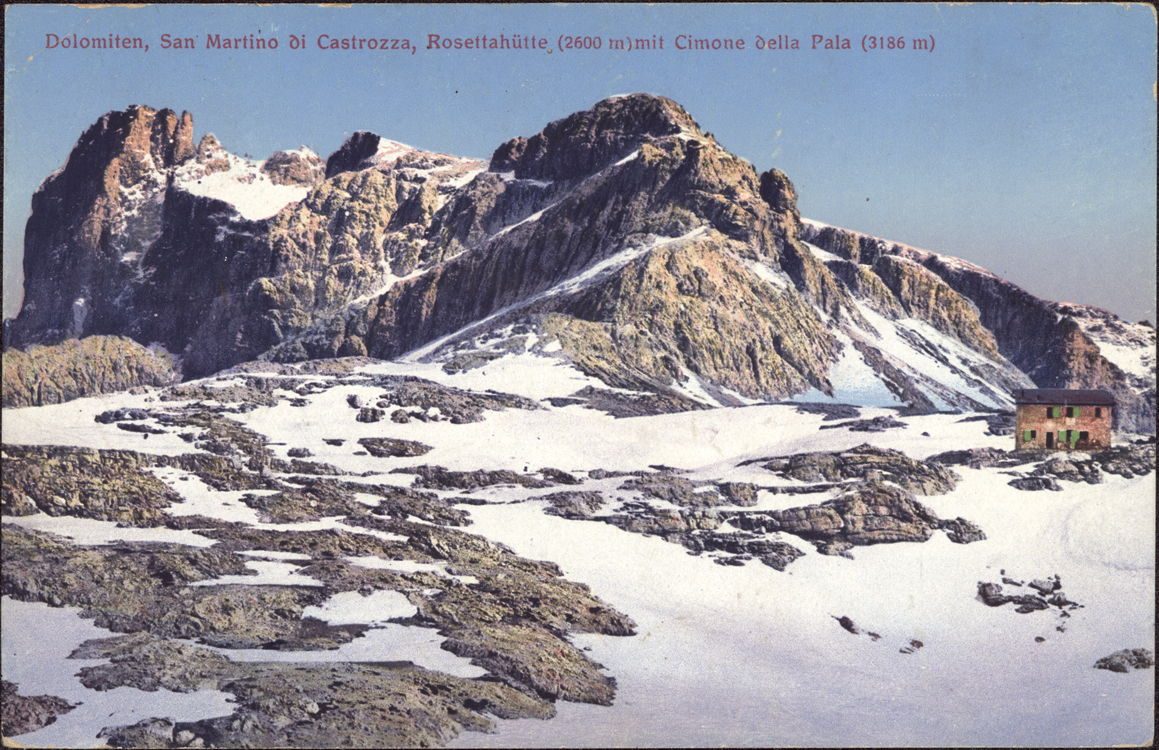 | Dolomiten, San Martino di Castrozza, Rosettahütte (2600 m) mit Cimone della Pala (3186) |