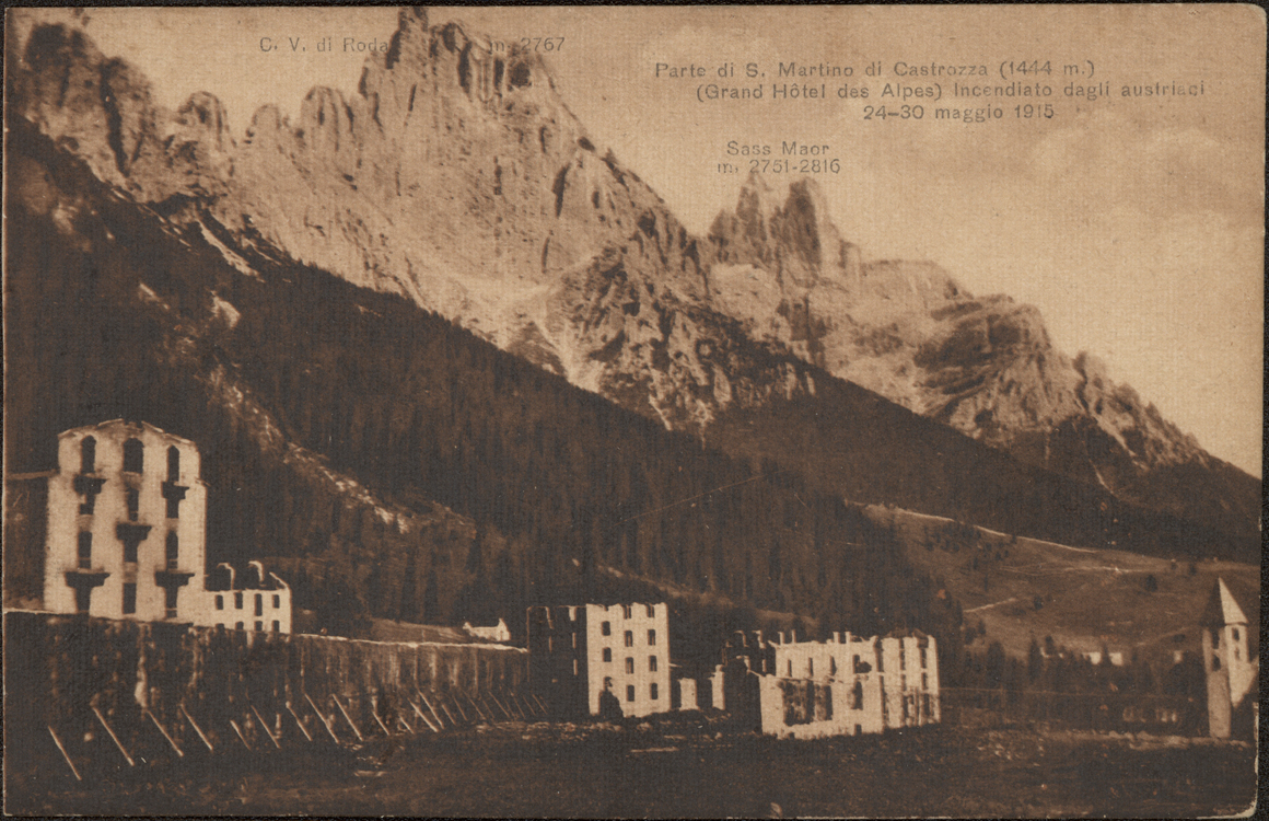 | Parte di S. Martino di Castrozza (1444 m.) (Grand Hotel des Alpes) incendiato dagli austriaci 24-30 maggio 1915 |