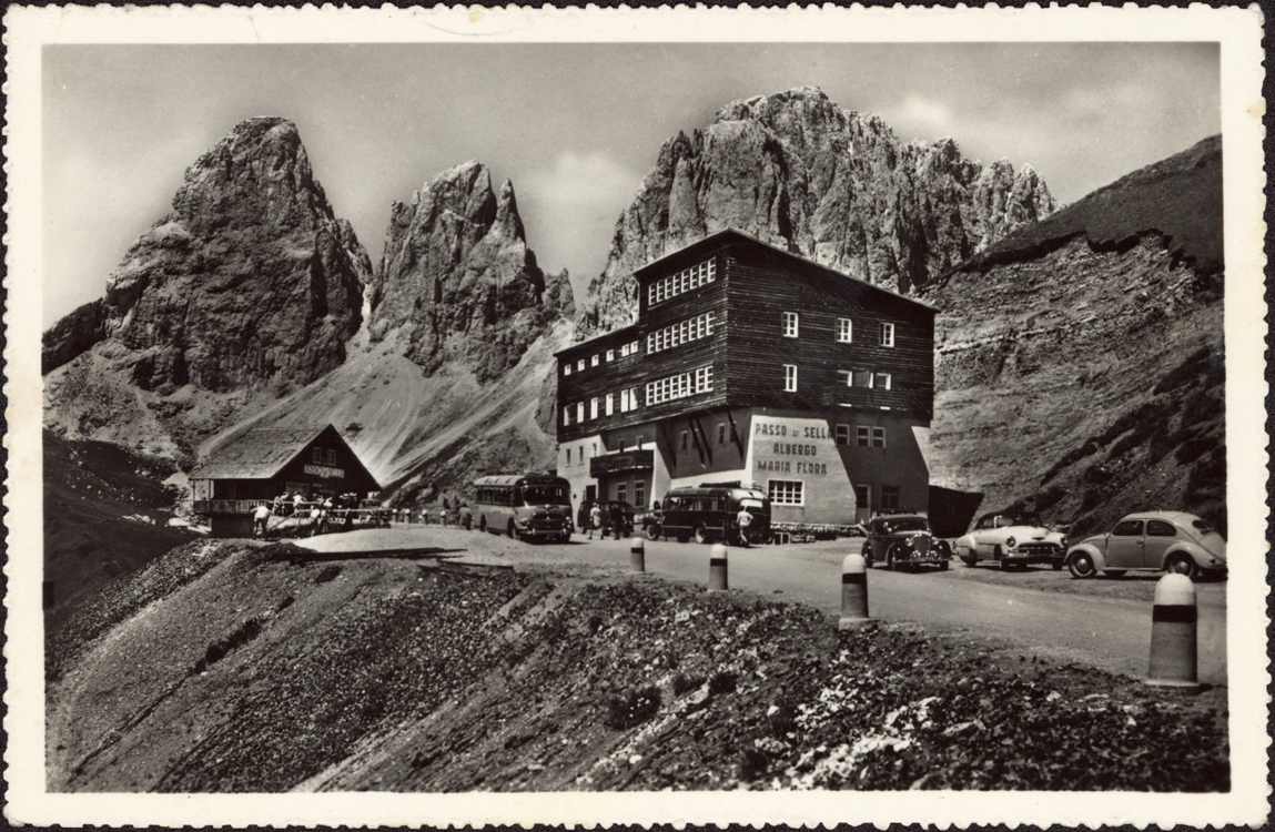 | Dolomiti - Passo Sella m. 2237 col Gruppo del Sassolungo e Albergo Maria Flora |