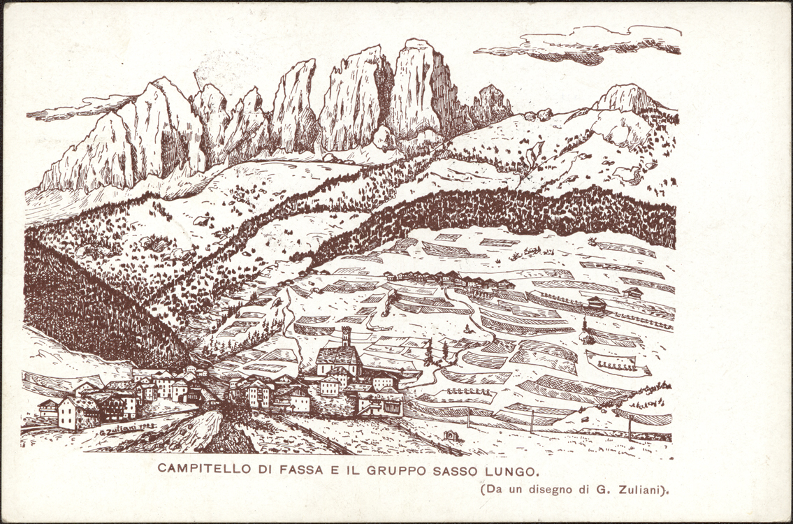 | Campitello di Fassa e il Gruppo Sasso Lungo (da un disegno di G. Zuliani) |