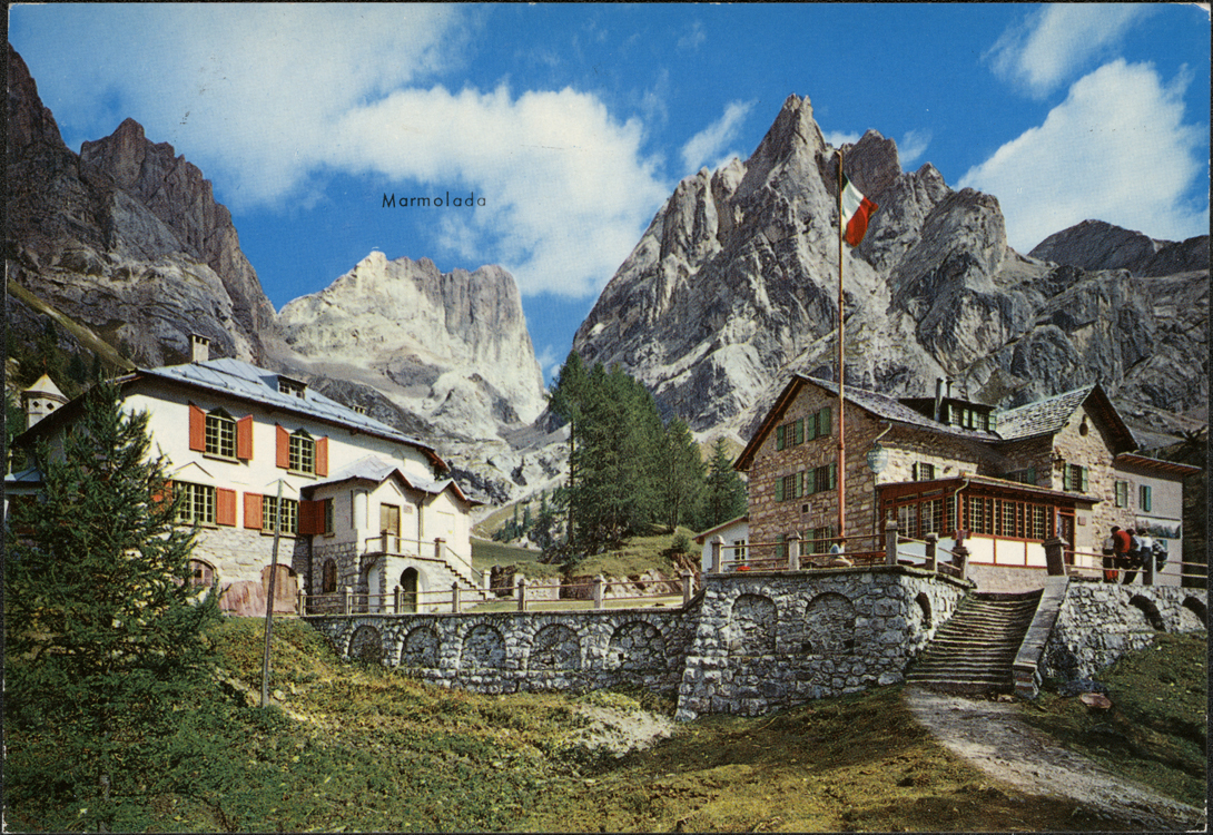 | Dolomiti (Trentino) Rifugi Contrin m. 2016 col Picc. Vernel, Marmolada m. 3342 (Par. Ovest) e C. Ombretta m. 2988 |