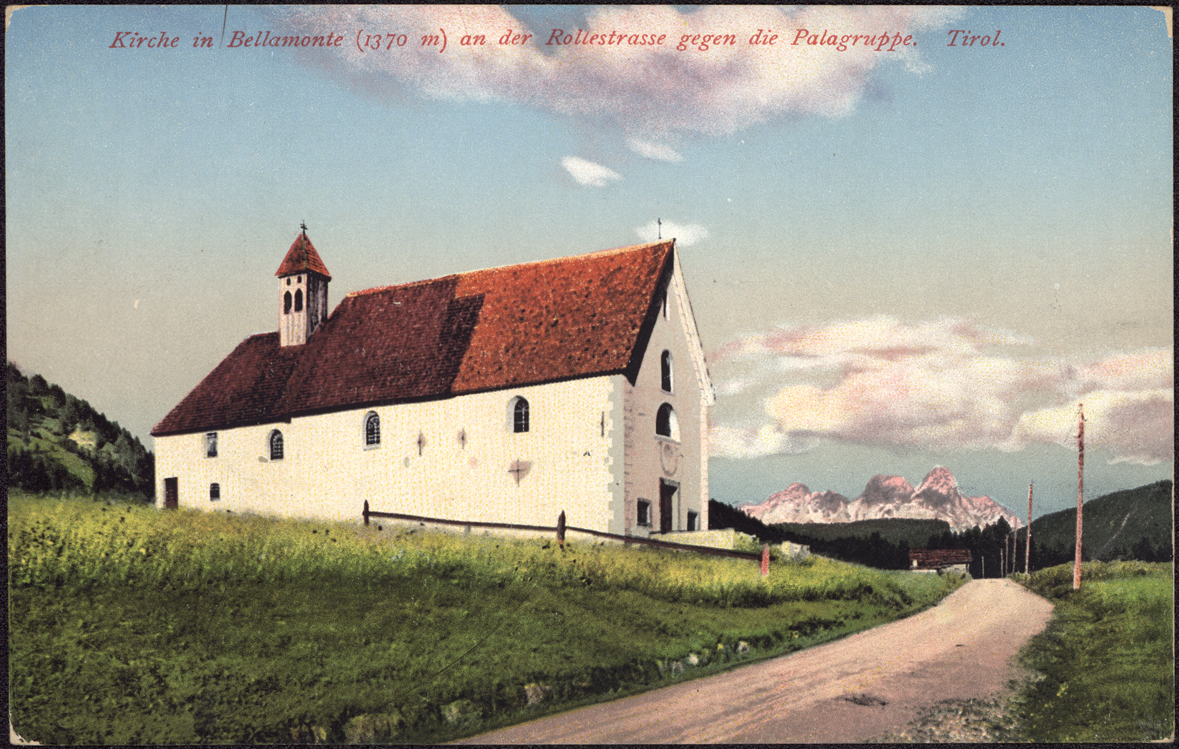 | Kirche in Bellamonte (1370 m) an der Rollerstrasse gegen die Palagruppe. Tirol. |