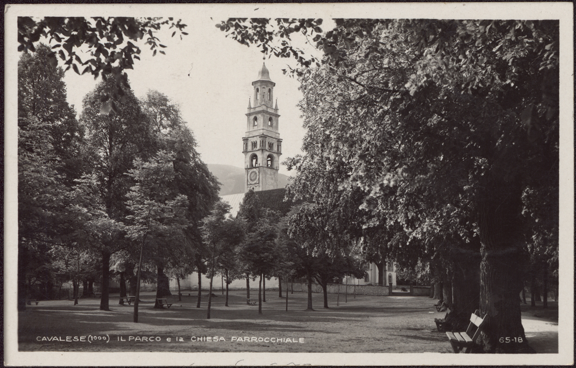 | Cavalese (1000) il parco e la chiesa parrocchiale |