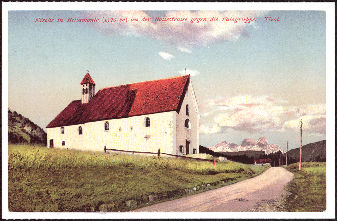 | Kirche in Bellamonte (1370 m) an der Rollerstrasse gegen die Palagruppe. Tirol |