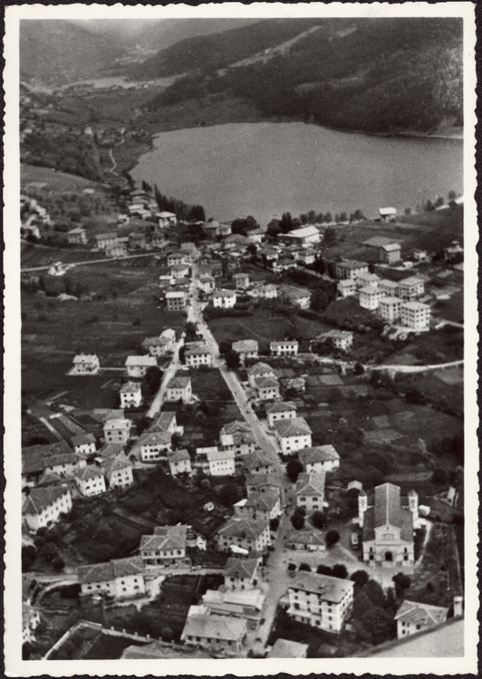 | Baselga e Seraia di Piné m. 967 col lago (Trentino) - Veduta dall'aereo |