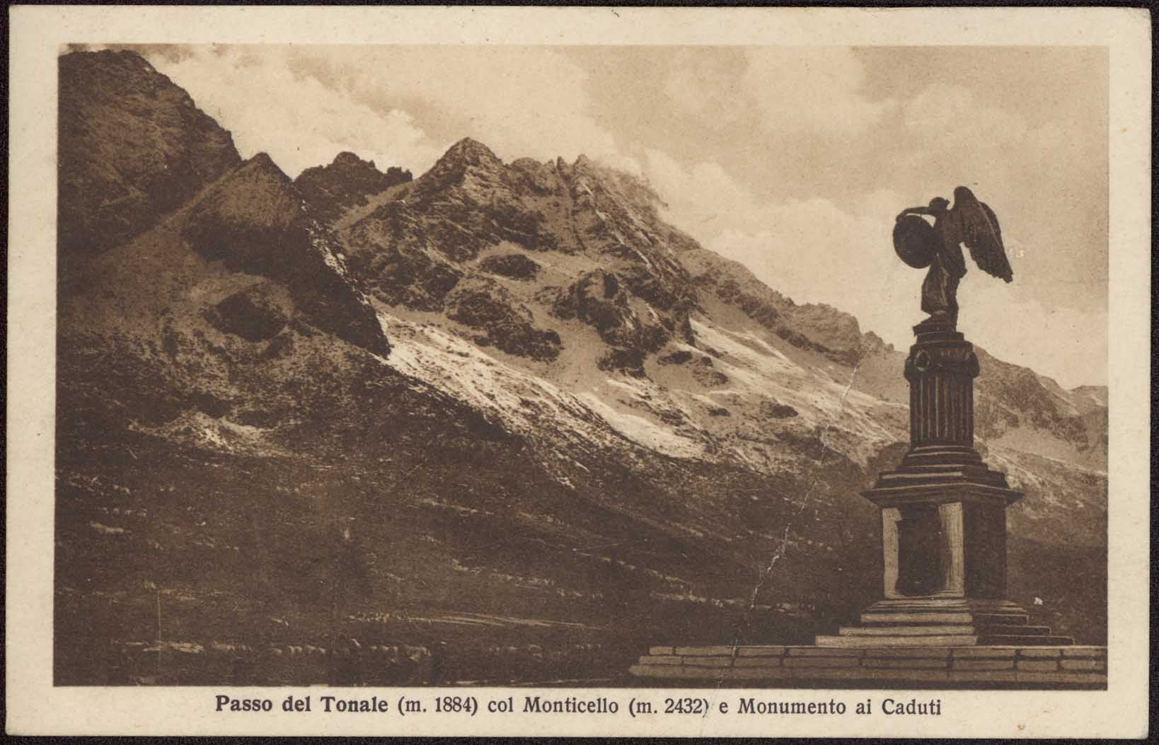| Passo del Tonale (m. 1884) col Monticello (m. 2432) e Monumento ai Caduti |