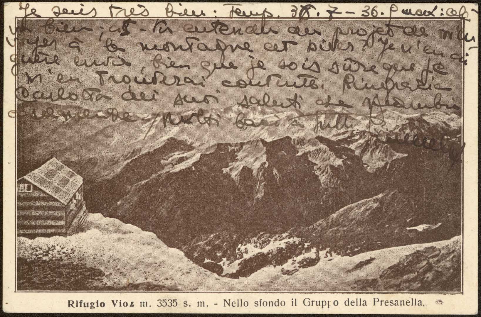 | Rifugio Vioz m. 3535 s. m. - Nello sfondo il Gruppo Presanella. |
