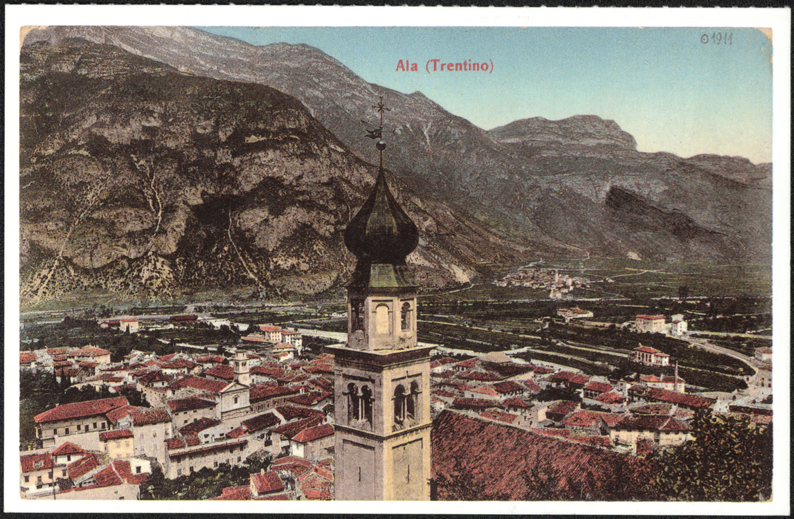 95x146 mm, color. Ristampa dell'edizione: Ala, Morandini, 1911, l'originale è conservato al Museo Nuvoli della cartolina di Isera