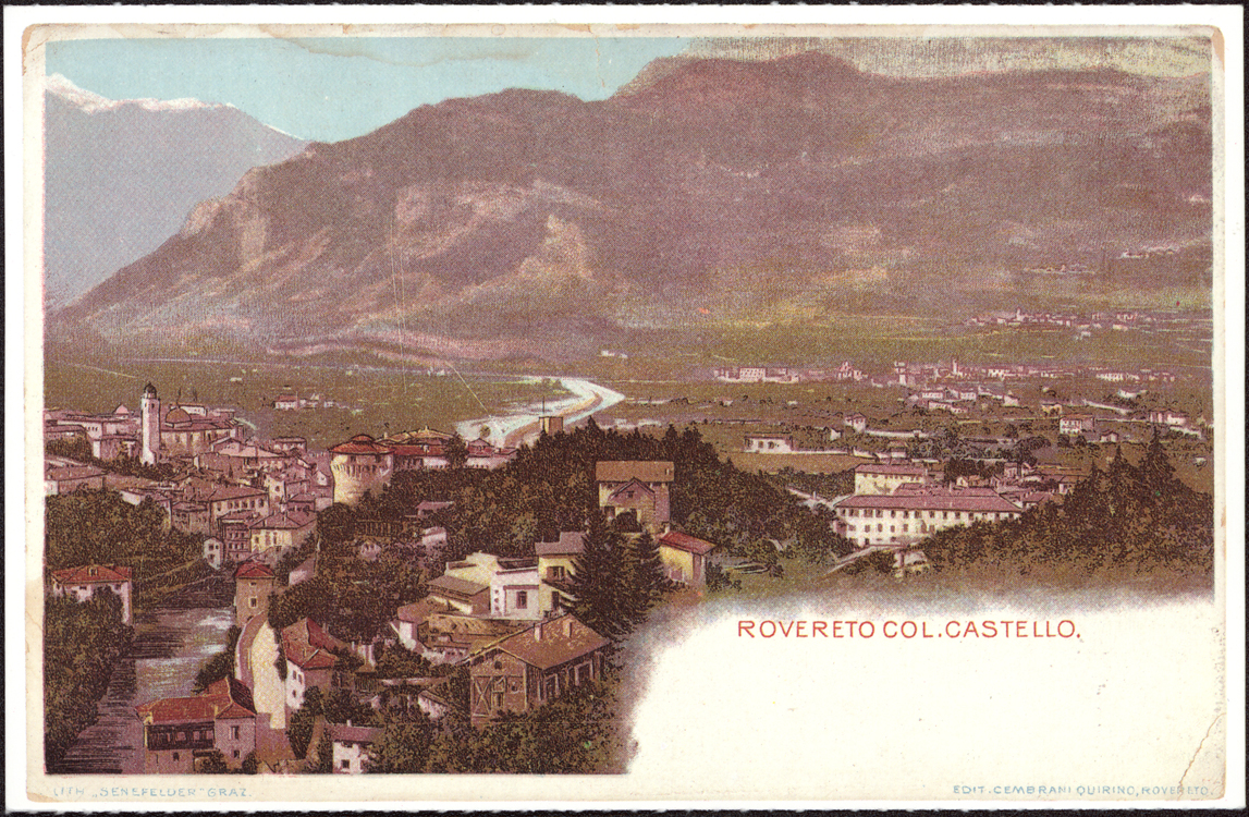 95x145 mm, color. Ristampa dell'edizione: Rovereto, Cembrani, 1900, l'originale è conservato al Museo Nuvoli della cartolina di Isera