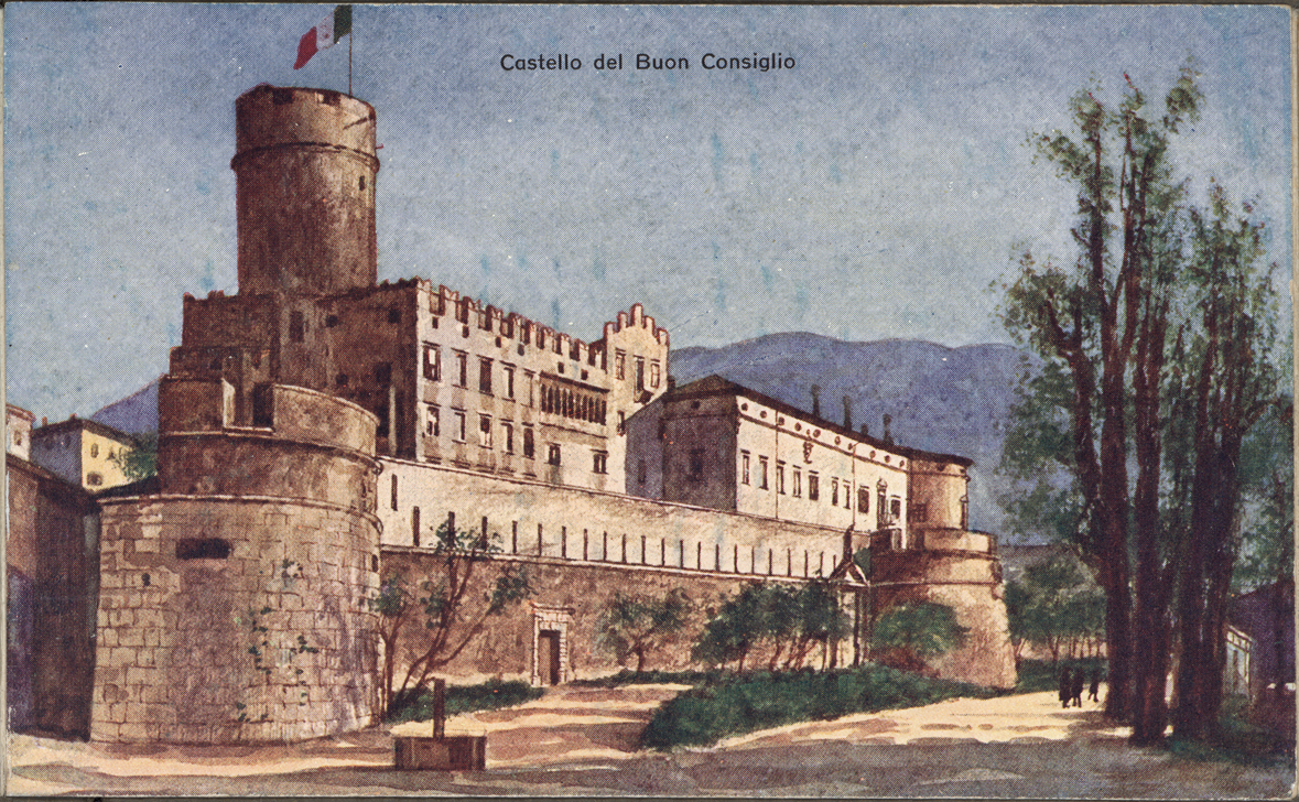 85x136 mm, color. Pubblicata probabilmente tra il 1920 e il 1930, rilegata con altre 23 cartoline dello stesso editore (titolo in copertina: Ricordo di Trento - 24 cartoline)