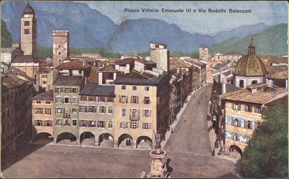 84x136 mm, color. Pubblicata probabilmente tra il 1920 e il 1930, rilegata con altre 23 cartoline dello stesso editore (titolo in copertina: Ricordo di Trento - 24 cartoline)