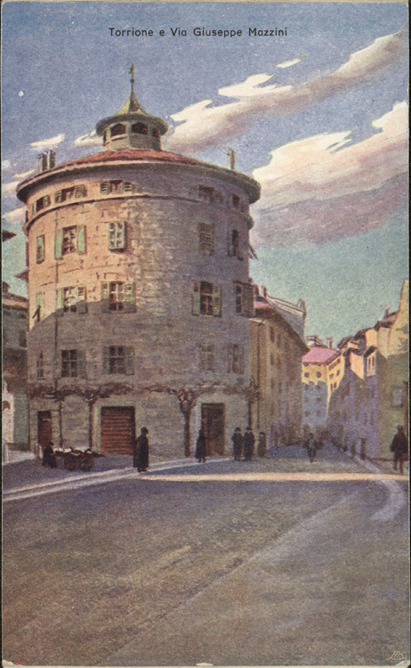 136x84 mm, color. Pubblicata probabilmente tra il 1920 e il 1930, rilegata con altre 23 cartoline dello stesso editore (titolo in copertina: Ricordo di Trento - 24 cartoline)