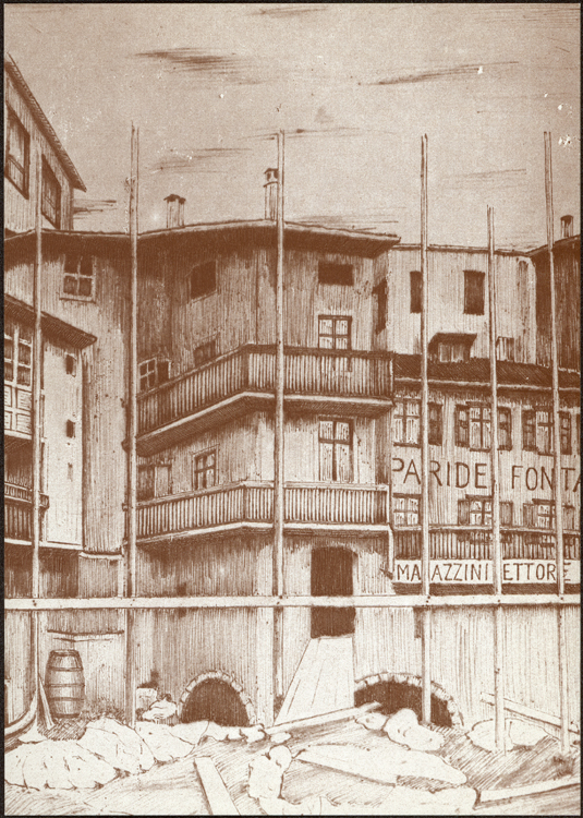 153x108 mm, b/n. Raccolta con altre 28 cartoline dello stesso editore in un cofanetto (titolo in copertina: Trento. Una trentina di cartoline della Trento d'altri tempi. Pirografie di Guido Baldessarini a cura di Aldo Bertoluzza)