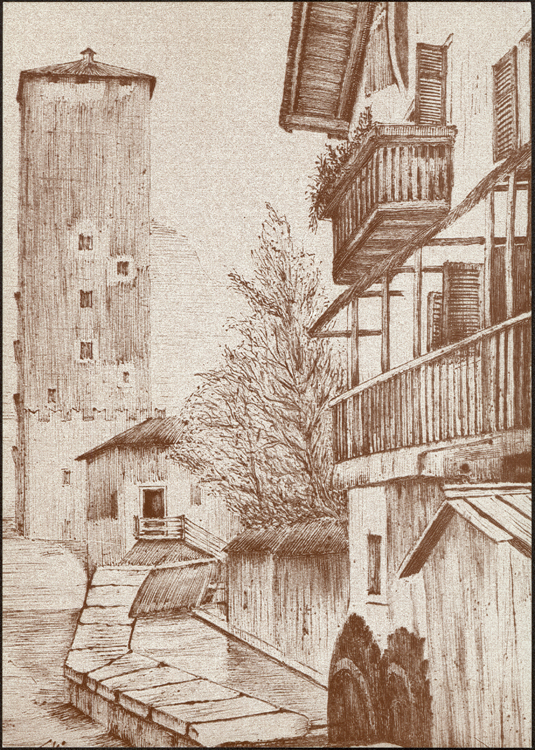 153x108 mm, b/n. Raccolta con altre 28 cartoline dello stesso editore in un cofanetto (titolo in copertina: Trento. Una trentina di cartoline della Trento d'altri tempi. Pirografie di Guido Baldessarini a cura di Aldo Bertoluzza)
