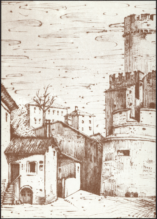 153x108 mm, b/n. Raccolta con altre 28 cartoline dello stesso editore in un cofanetto (titolo in copertina: Trento. Una trentina di cartoline della Trento d'altri tempi. Pirografie di Guido Baldessarini a cura di Aldo Bertoluzza)