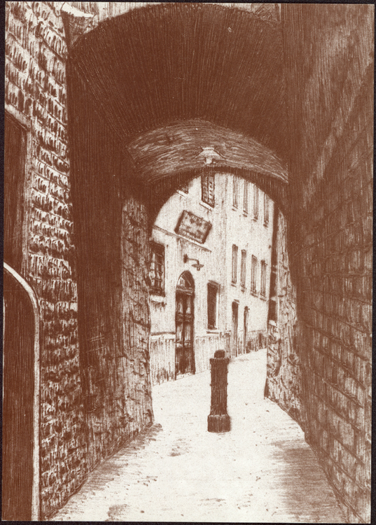 153x108 mm, b/n. Raccolta con altre 28 cartoline dello stesso editore in un cofanetto (titolo in copertina: Trento. Una trentina di cartoline della Trento d'altri tempi. Pirografie di Guido Baldessarini a cura di Aldo Bertoluzza)