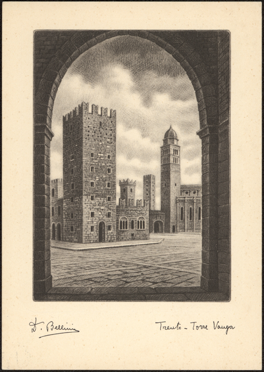 149x104 mm, b/n. Pubblicata probabilmente tra il 1920 e il 1930, raccolta in un pieghevole con altre 6 cartoline dello stesso editore (titolo in copertina: Città d'Italia - Trento)